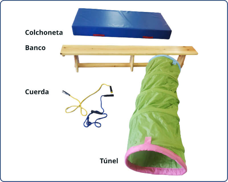 - He estado pensando, ¿qué pasaría si tuvierais que andar y pasar por varios sitios con los ojos cerrados?, ¿Tendréis el tacto bien desarrollado? -. (Los niños yendo con los ojos cerrados, tendrán que pasar gateando, por encima de un banco, una colchoneta, por encima del suelo, por encima de una cuerda y por dentro de un túnel de los de tela. Ver Anexo1). (En unos 10 minutos haremos el circuito).