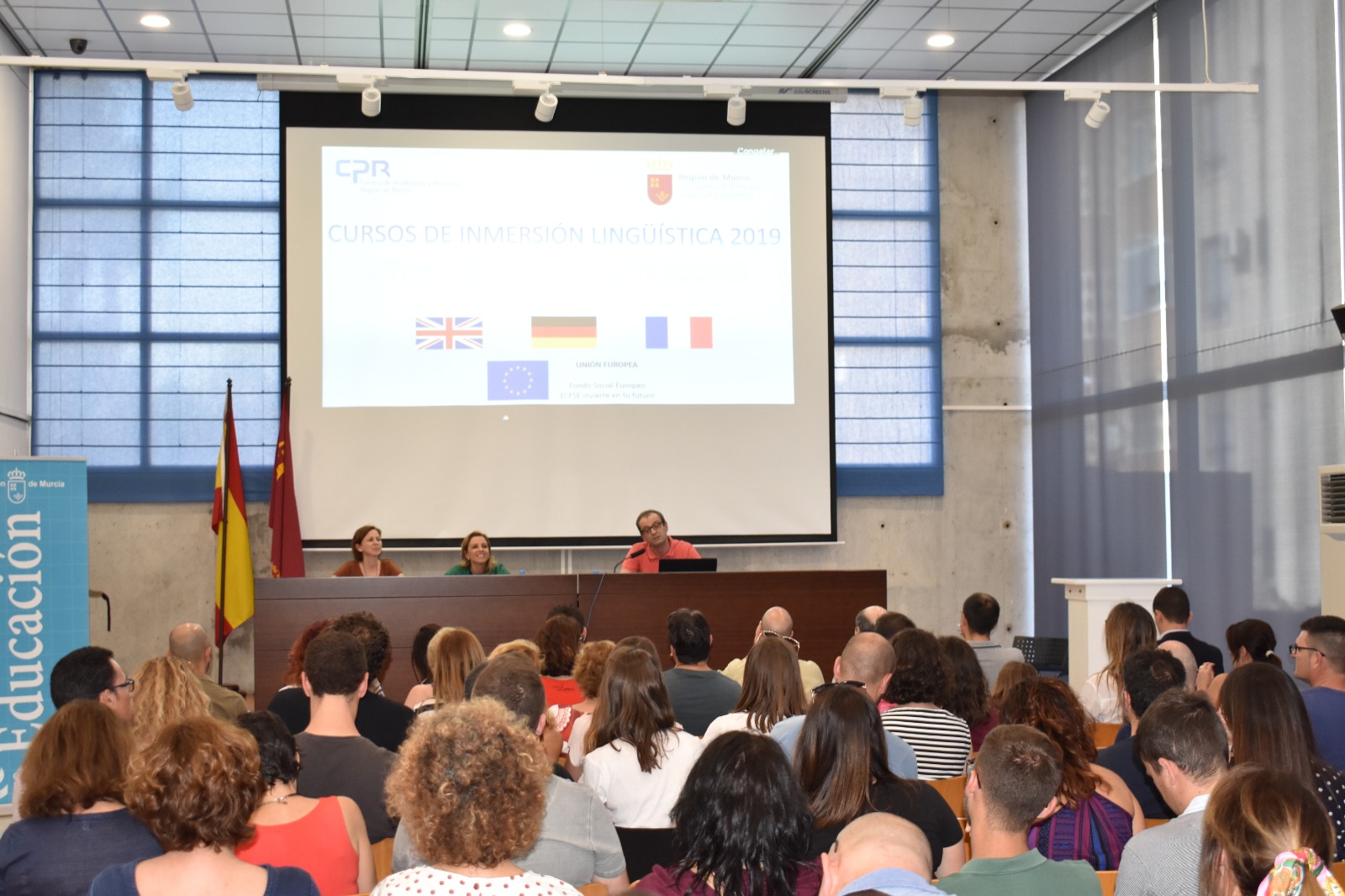 La consejera de Educación, Juventud y Deportes en funciones, Adela Martínez-Cachá, se dirige a los 84 docentes que estarán en el extranjero durante un mes con motivo de una inmersión lingüística