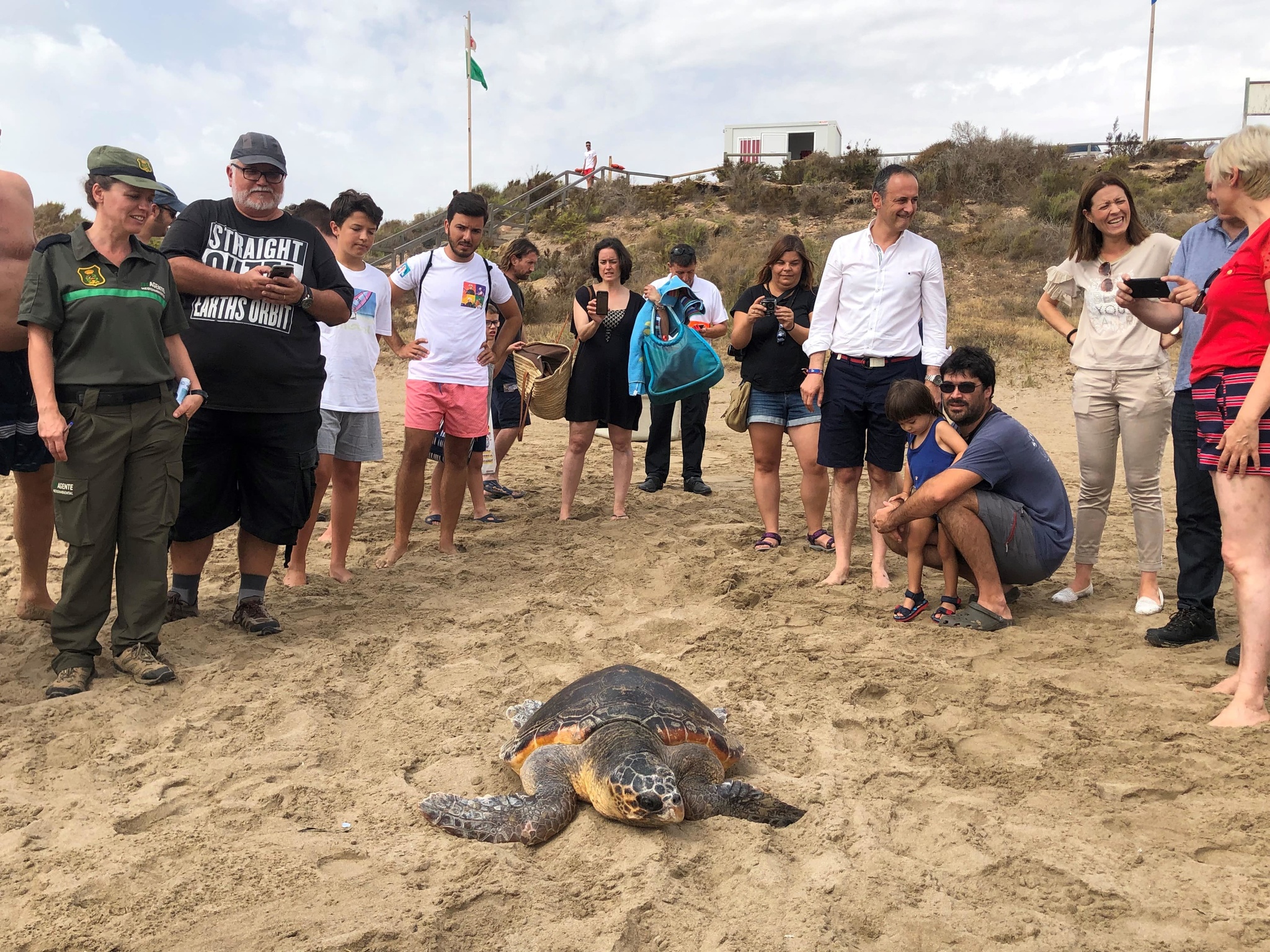 El consejero de Empleo, Universidades, Empresa y Medio Ambiente en funciones, Javier Celdrán, durante la liberación en Águilas de un ejemplar de tortuga boba tratada en el Centro de Recuperación de Fauna Silvestre de El Valle (I)