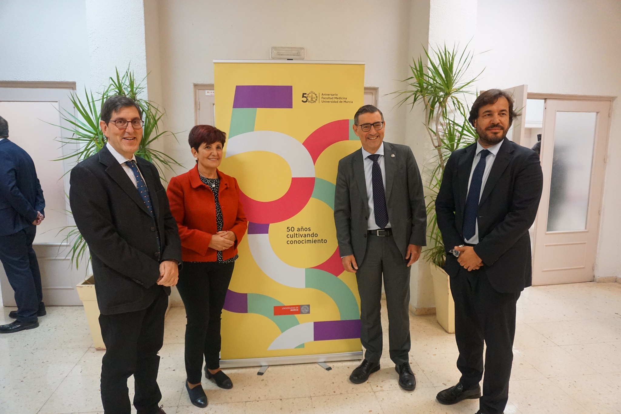 Los consejeros de Salud, Manuel Villegas, y de Empleo, Investigación y Universidades, Miguel Motas, junto al rector de la Universidad de Murcia, José Luján, y la decana de la facultad de Medicina de la Universidad de Murcia, Carmen Robles, en la inauguración de los actos conmemorativos del 50 aniversario de la Facultad de Medicina.