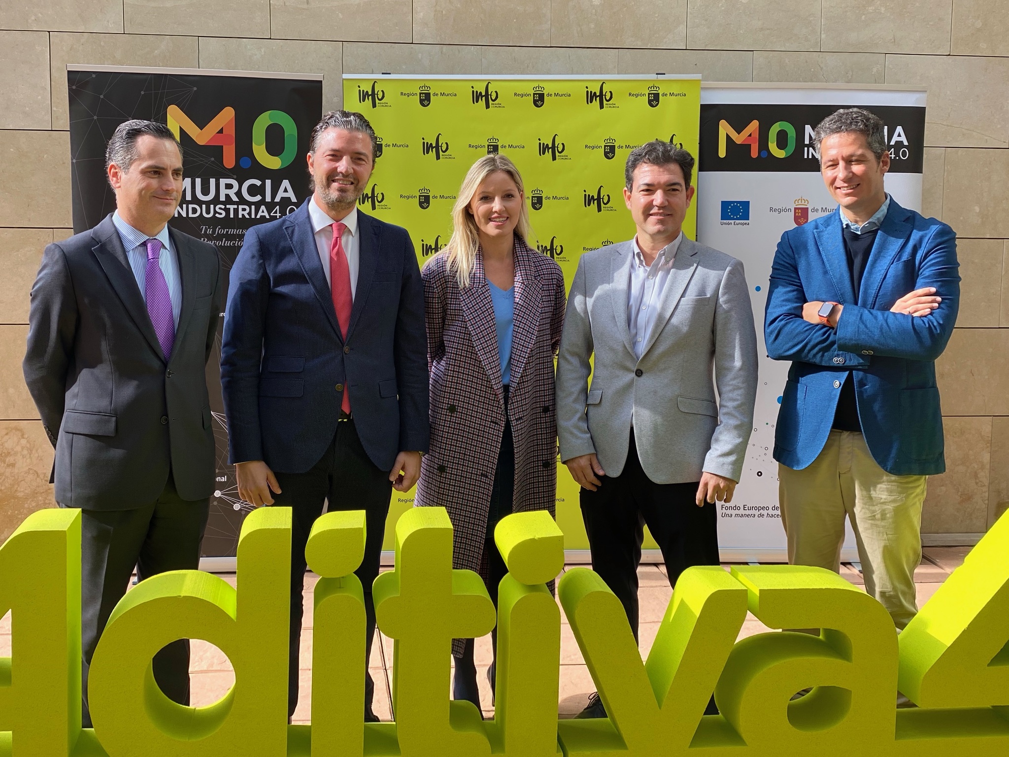 El director del Instituto de Fomento (Info), Diego Rodríguez-Linares (1i), el presidente de la Federación Regional de Empresarios del Metal (Fremm), Alfonso Hernández Zapata (2i) consejera de Empresa, Industria y Portavocía, Ana Martínez Vidal (c) miembro del comité Técnico de Aditiva, Juan Esteban Sánchez y el presidente de la Asociación de Fabricantes de Maquinaria de la Región de Murcia (Afamur), Gregorio Navarro Riquelme (2d).