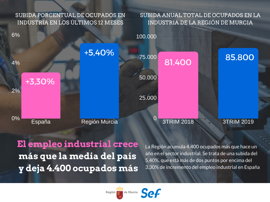 Gráfico que muestra el incremento bruto anual de ocupados en la industria regional, así como la comparación en términos relativos de ese incremento con el de España