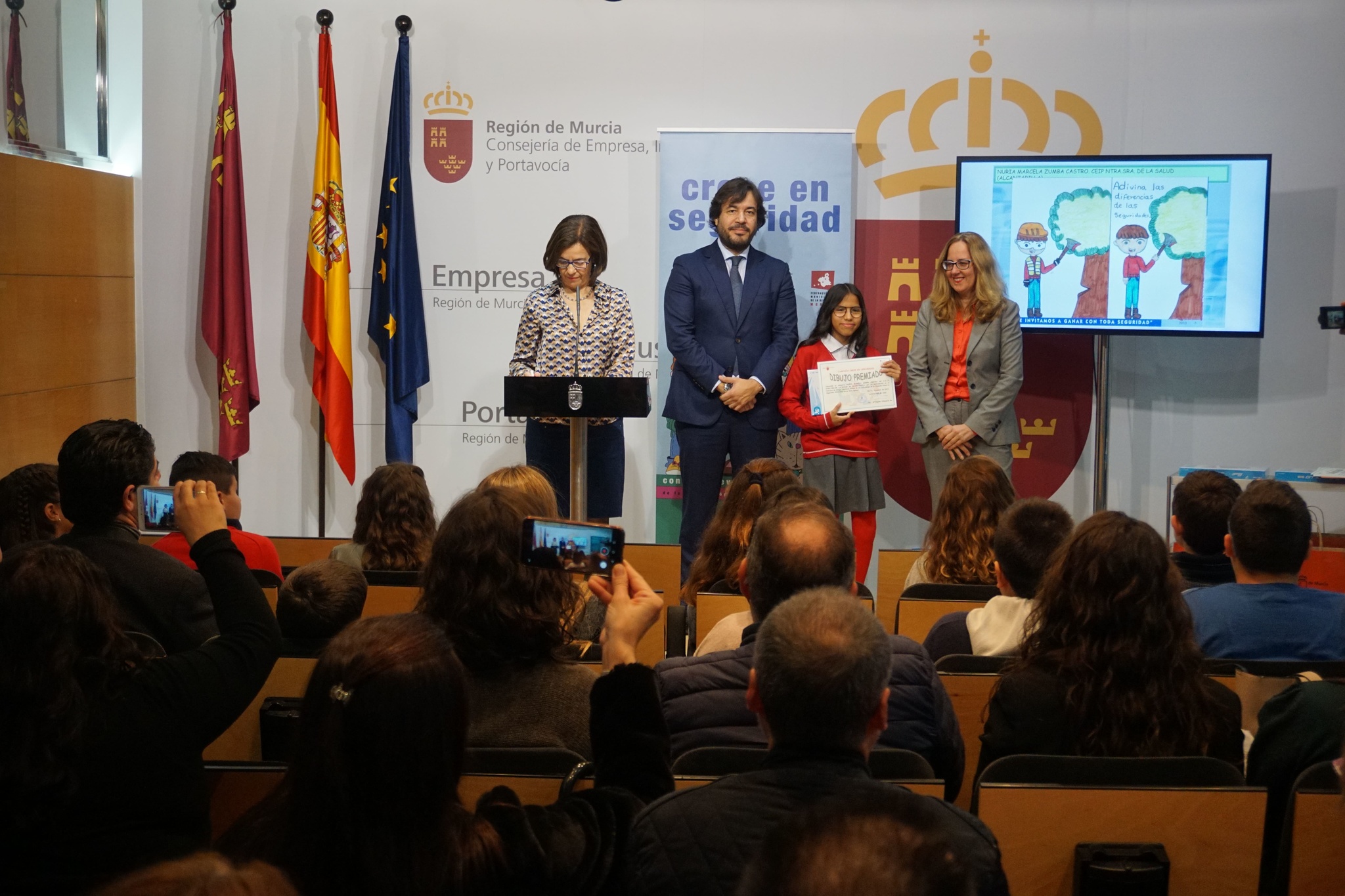 El consejero de Empleo, Investigación y Universidades, Miguel Motas, junto con los diez alumnos ganadores del concurso de dibujo ‘Crece en seguridad’.