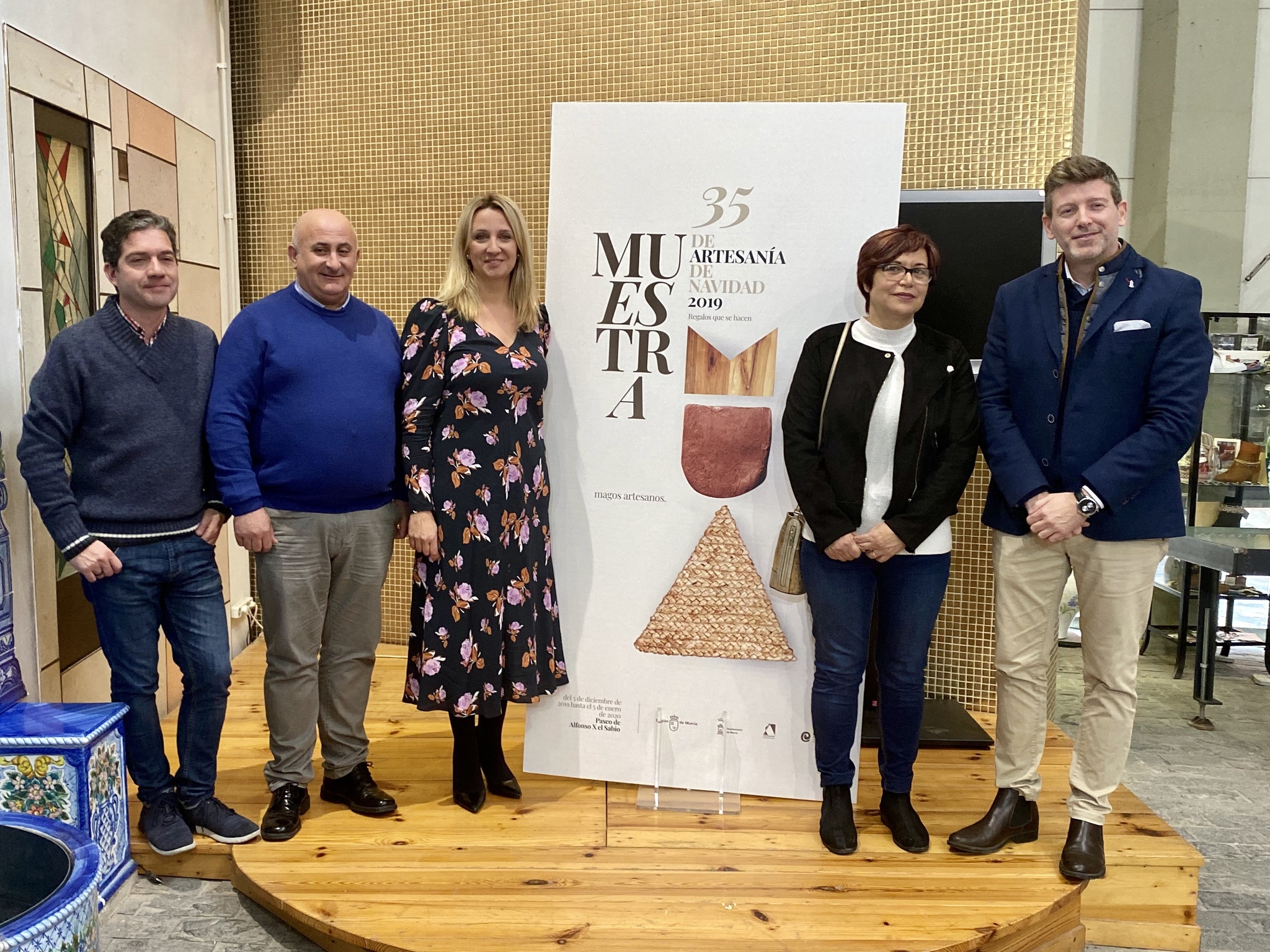 La directora general de Comercio, Consumo y Artesanía, Carolina Espinosa (c) acompañada de los artesanos Guillermo Sánchez Rubio (1i) y Arcadio Hernández (2i), la presidenta de la Asociación Artesana ‘CREA’, Carmen Martínez Azorín (2d) y el concejal de Comercio, Mercados y Vía Pública, Juan Hernández Piernas (1d).