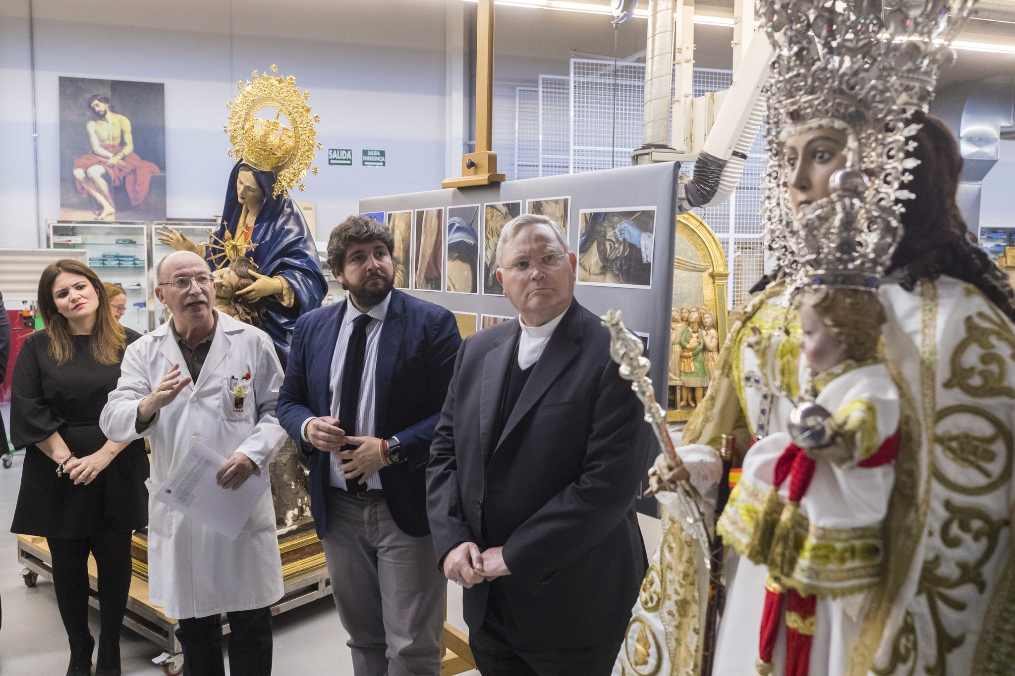 El presidente de la Comunidad, Fernando López Miras, durante su visita al Centro de Restauración de la Región de Murcia para conocer los trabajos que se están realizando sobre las imágenes de la Virgen de la Fuensanta, patrona de Murcia, y de la Virgen de la Caridad, patrona de Cartagena.