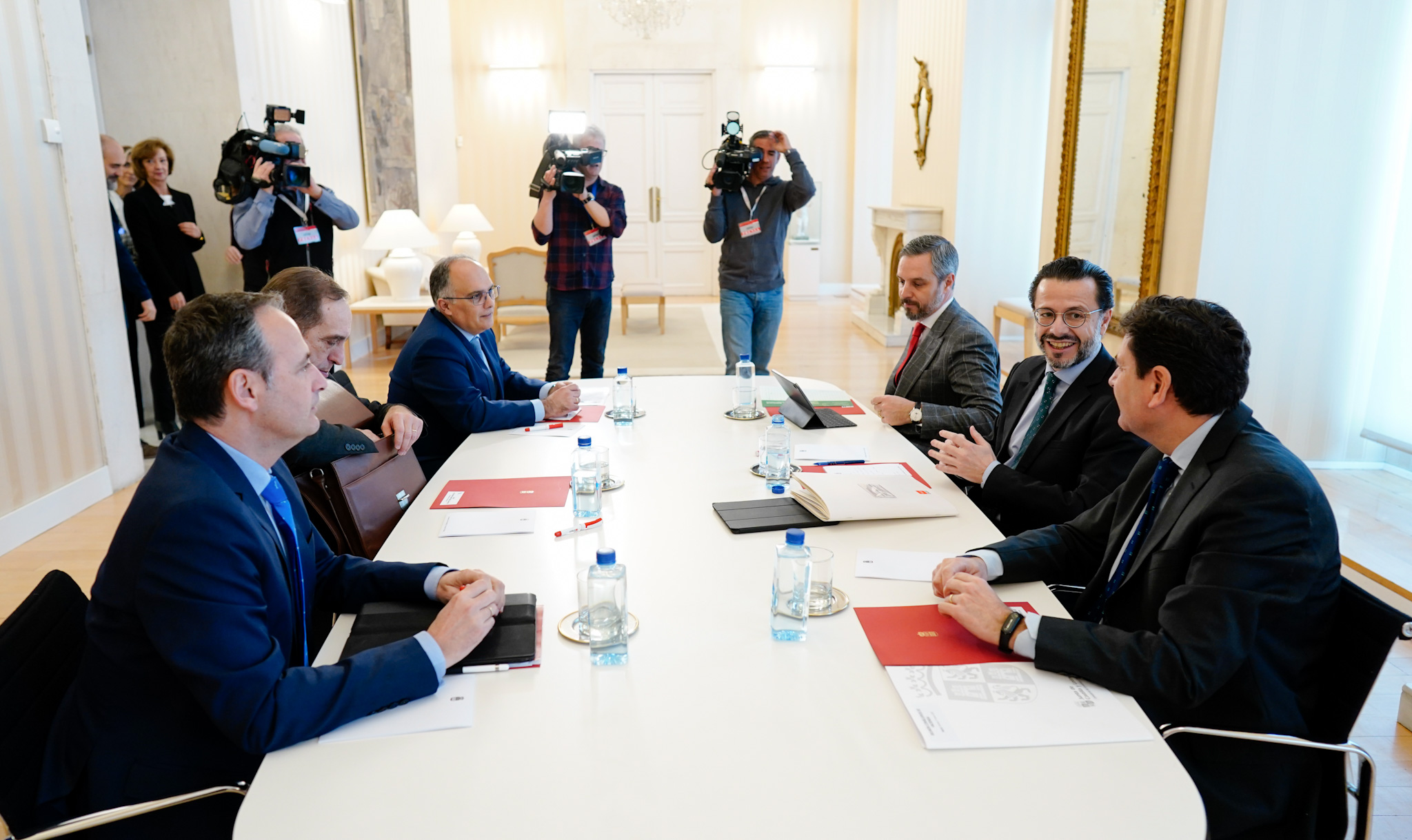 Momento de la reunión de los consejeros del área de Hacienda de Murcia, Javier Celdrán (1i); Galicia, Valeriano Martínez (2i); Ceuta, Alberto Gaitán (3i); Castilla y León, Carlos Fernández (1d); Javier Fernández-Lasquetty (2d) y de Andalucía, Juan Bravo (3d)