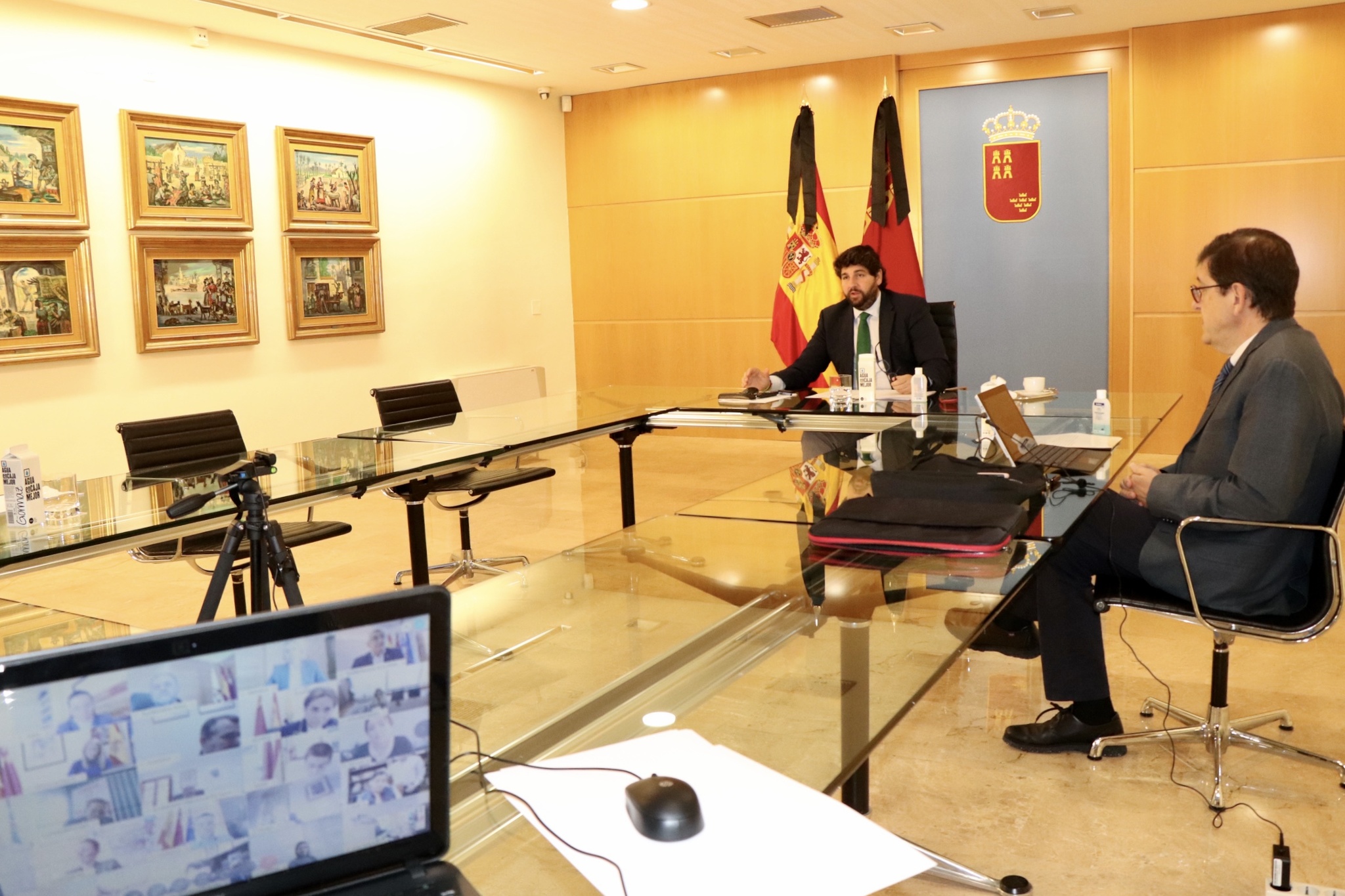 Reunión telemática mantenida entre el presidente de la Comunidad, Fernando López Miras, acompañado por el consejero de Salud, Manuel Villegas, y los alcaldes de los 45 ayuntamientos de la Región (1)