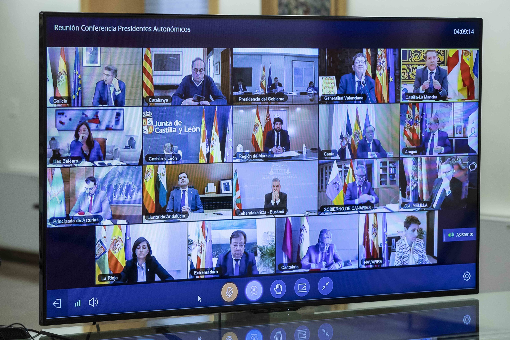 El jefe del Ejecutivo regional, Fernando López Miras, participa en la reunión por vía telemática de dirigentes autonómicos con el presidente del Gobierno central, Pedro Sánchez.