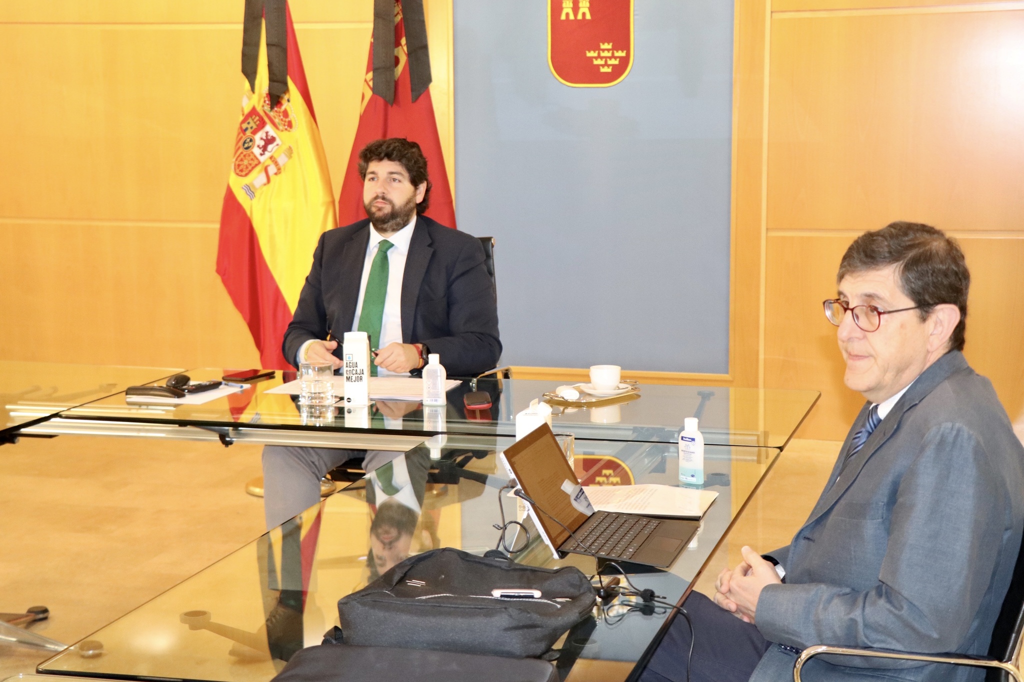 Reunión telemática mantenida entre el presidente de la Comunidad, Fernando López Miras, acompañado por el consejero de Salud, Manuel Villegas, y los alcaldes de los 45 ayuntamientos de la Región (2)