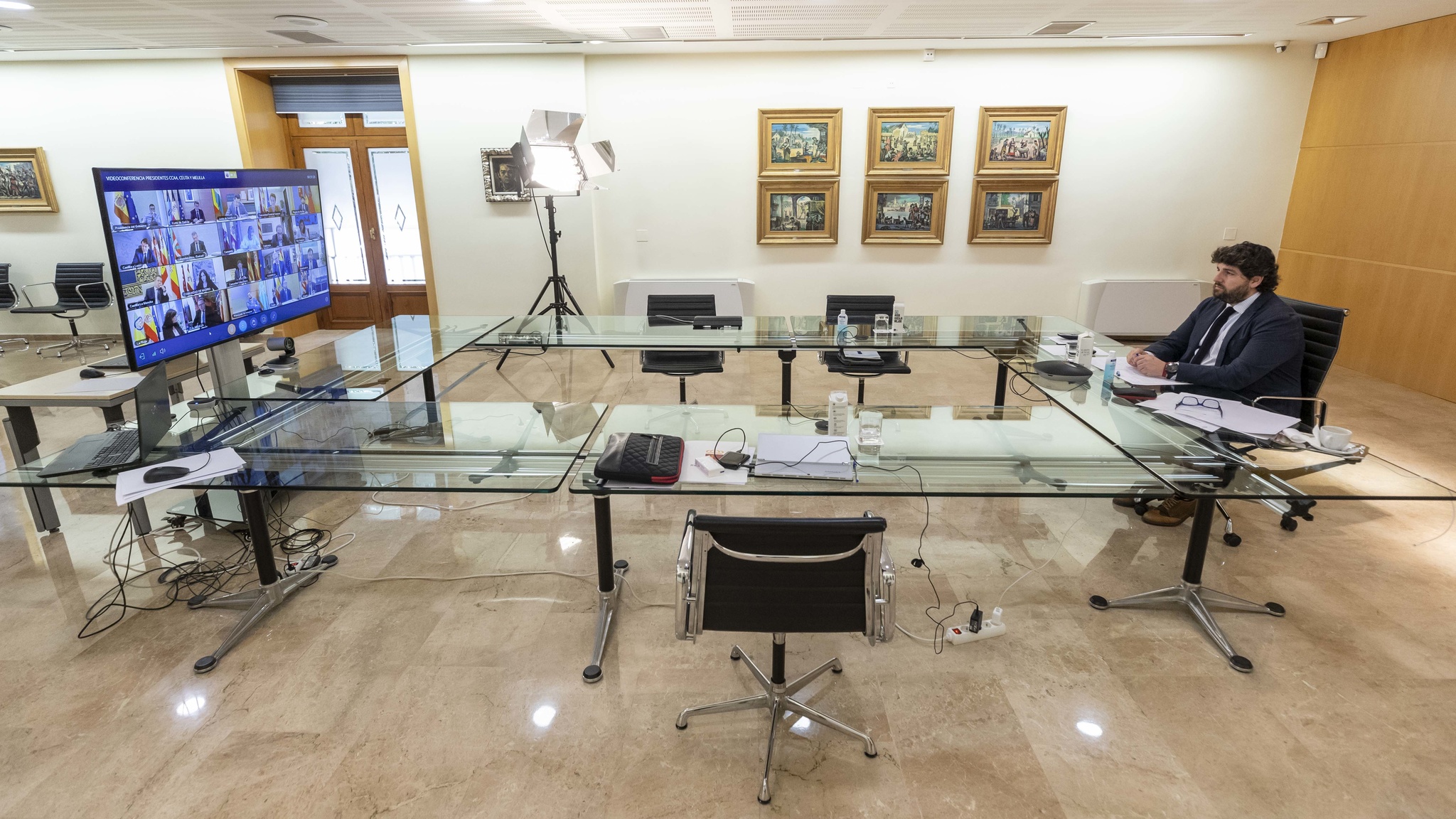 El jefe del Ejecutivo regional, Fernando López Miras, ha participado en la reunión por vía telemática de dirigentes autonómicos con el presidente del Gobierno central, Pedro Sánchez