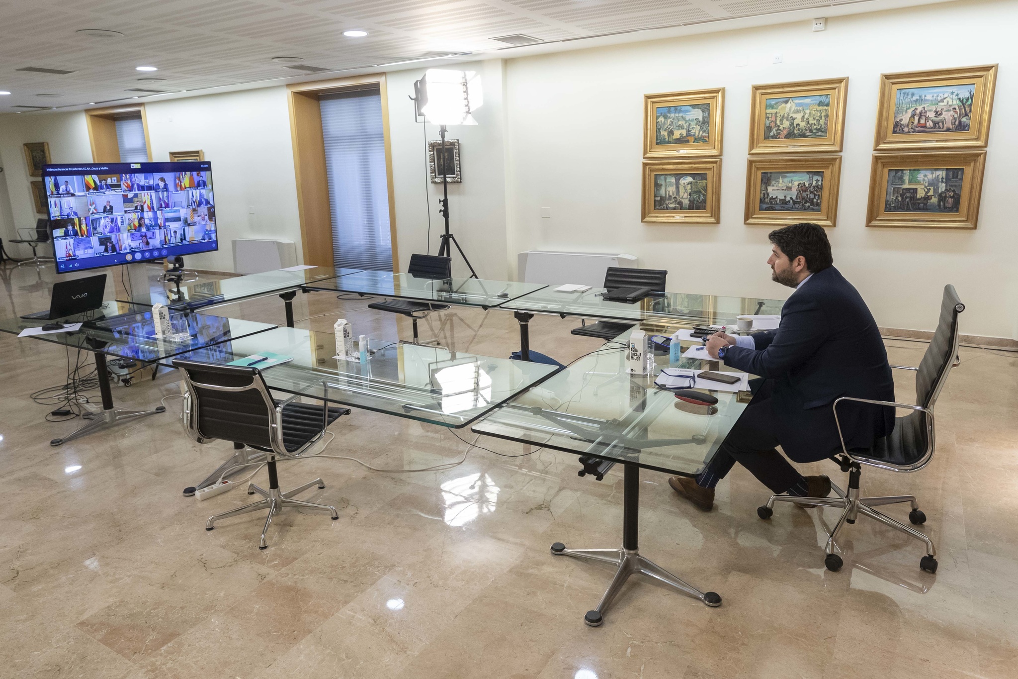 El jefe del Ejecutivo regional, Fernando López Miras, participa en la reunión por vía telemática de dirigentes autonómicos con el presidente del Gobierno central, Pedro Sánchez (1)