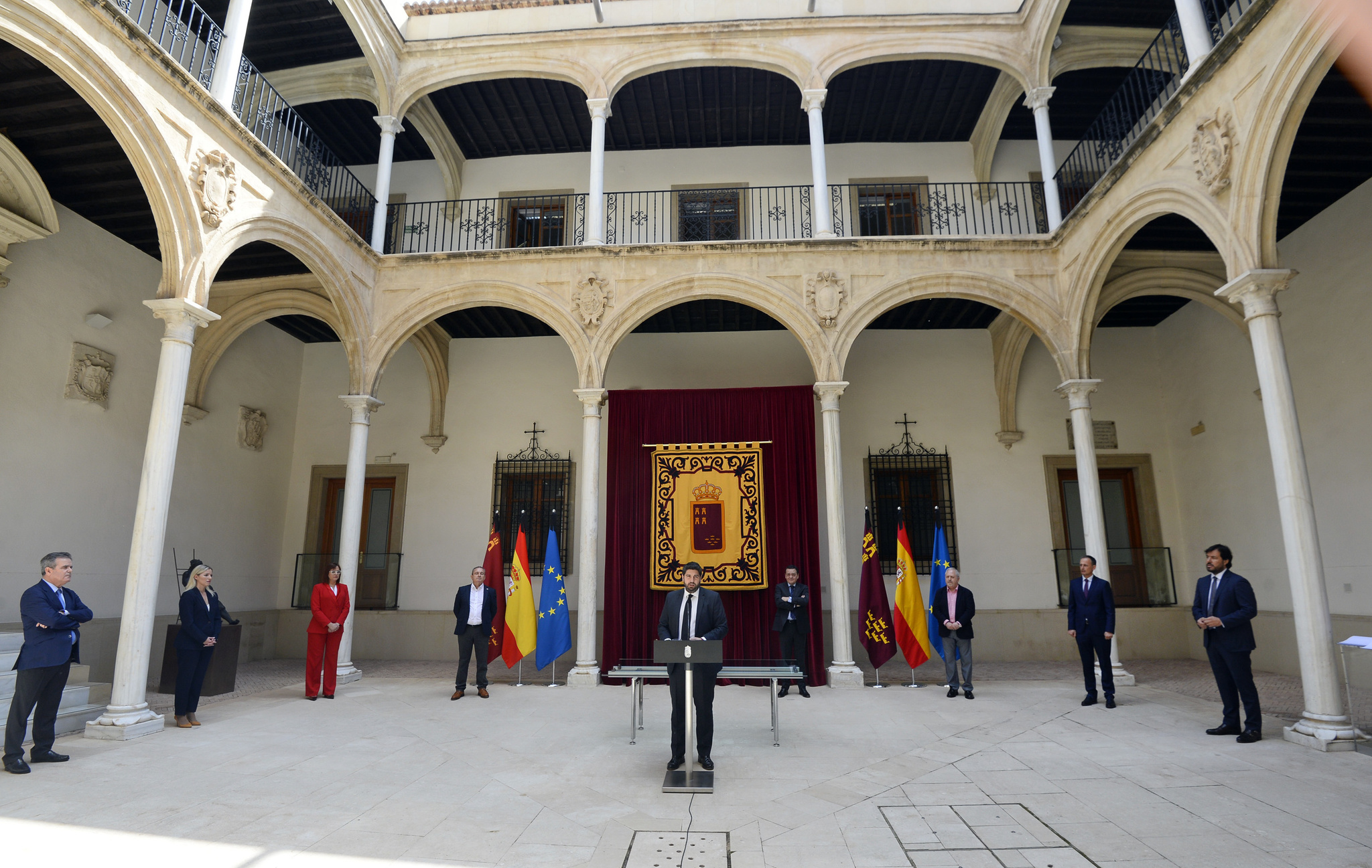 El presidente de la Comunidad, Fernando López Miras, el presidente de Croem, José María Albarracín, y los secretarios generales de los sindicatos CCOO, Santiago Navarro, y UGT, Antonio Jiménez.