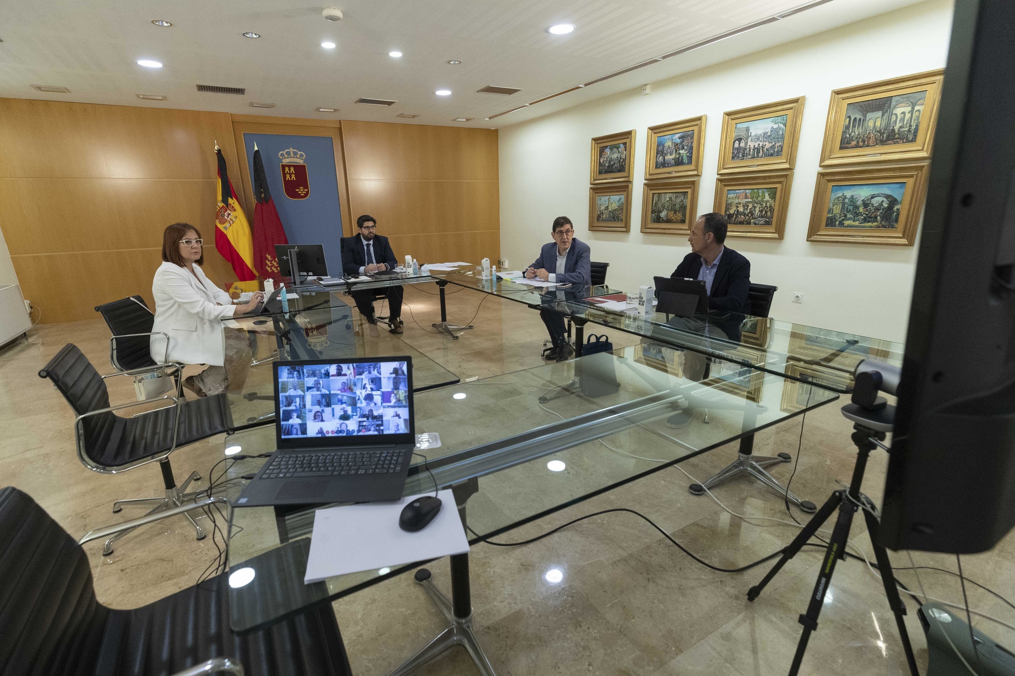 El presidente de la Comunidad, Fernando López Miras, durante el encuentro por vía telemática con los alcaldes de los 45 municipios para coordinar todas las actuaciones relacionadas con el Covid-19.