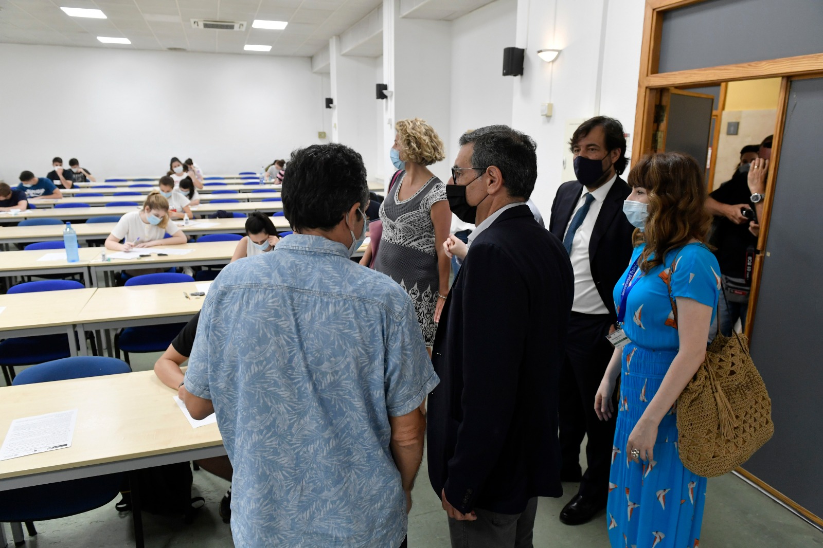 El consejero de Empleo, Investigación y Universidades, Miguel Motas, comprobó hoy el desarrollo de la primera jornada de las pruebas de la EBAU en la Región de Murcia, con la visita a las sedes de La Merced, en Murcia, acompañado por el rector de la Universidad de Murcia, José Luján, y la Facultad de Ciencias del Deporte, en San Javier, junto al alcalde, José Miguel Luengo, donde destacó que “se está cumpliendo escrupulosamente el protocolo higiénico y sanitario, para lo que estamos contando con una gran colaboración por parte de los alumnos”.