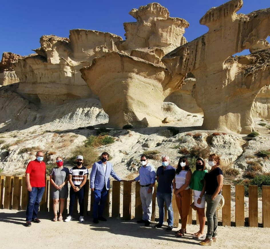 El director general de Medio Natural, Fulgencio Perona, junto al alcalde de Mazarrón, Gaspar Miras, junto al vallado de protección de las Gredas de Bolnuevo