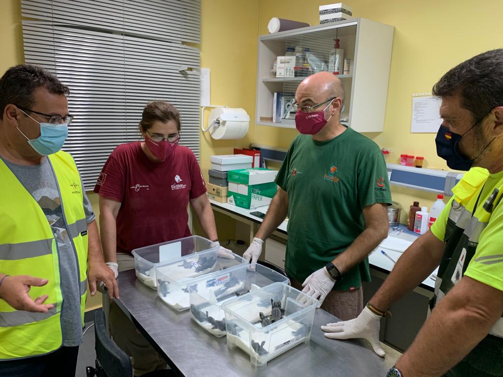 El director general del Medio Natural, Fulgencio Perona (1d) y personal del departamento y Centro de Recuperación de Fauna 'El Valle', contemplando las tortugas nacidas anoche en La Manga.