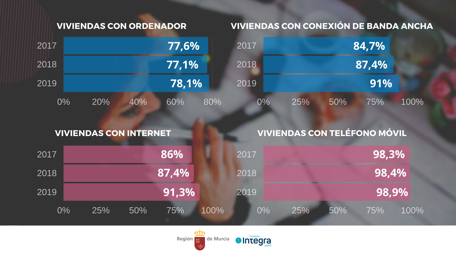 Gráfico que muestra la evolución en los tres últimos años de diversos parámetros relacionados con el uso de TIC en la Región de Murcia