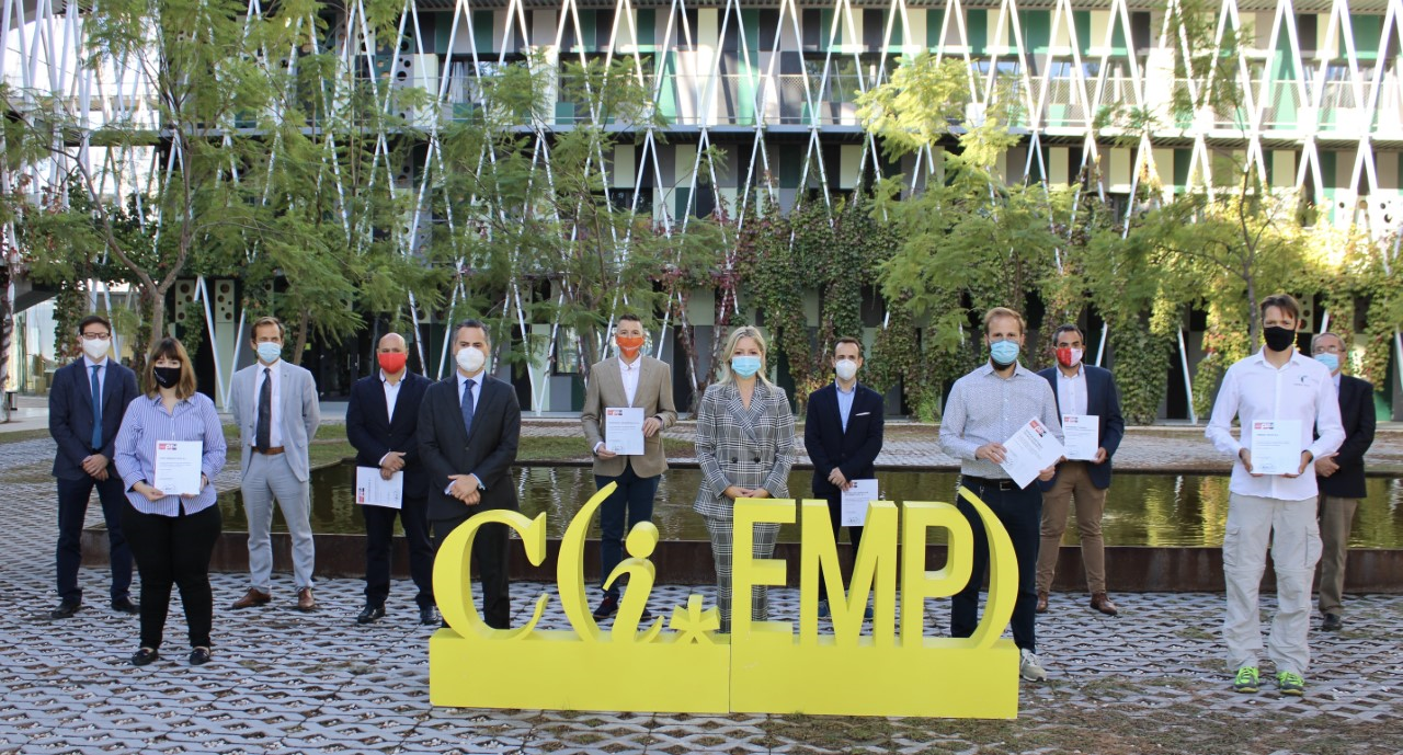 la consejera de Empresa, Industria y Portavocía, Ana Martínez Vidal (c) y el director del Instituto de Fomento, Diego Rodríguez-Linares (1i) junto a los responsables de las siete firmas galardonadas con los certificados de empresas innovadoras tecnológicas EIBTs