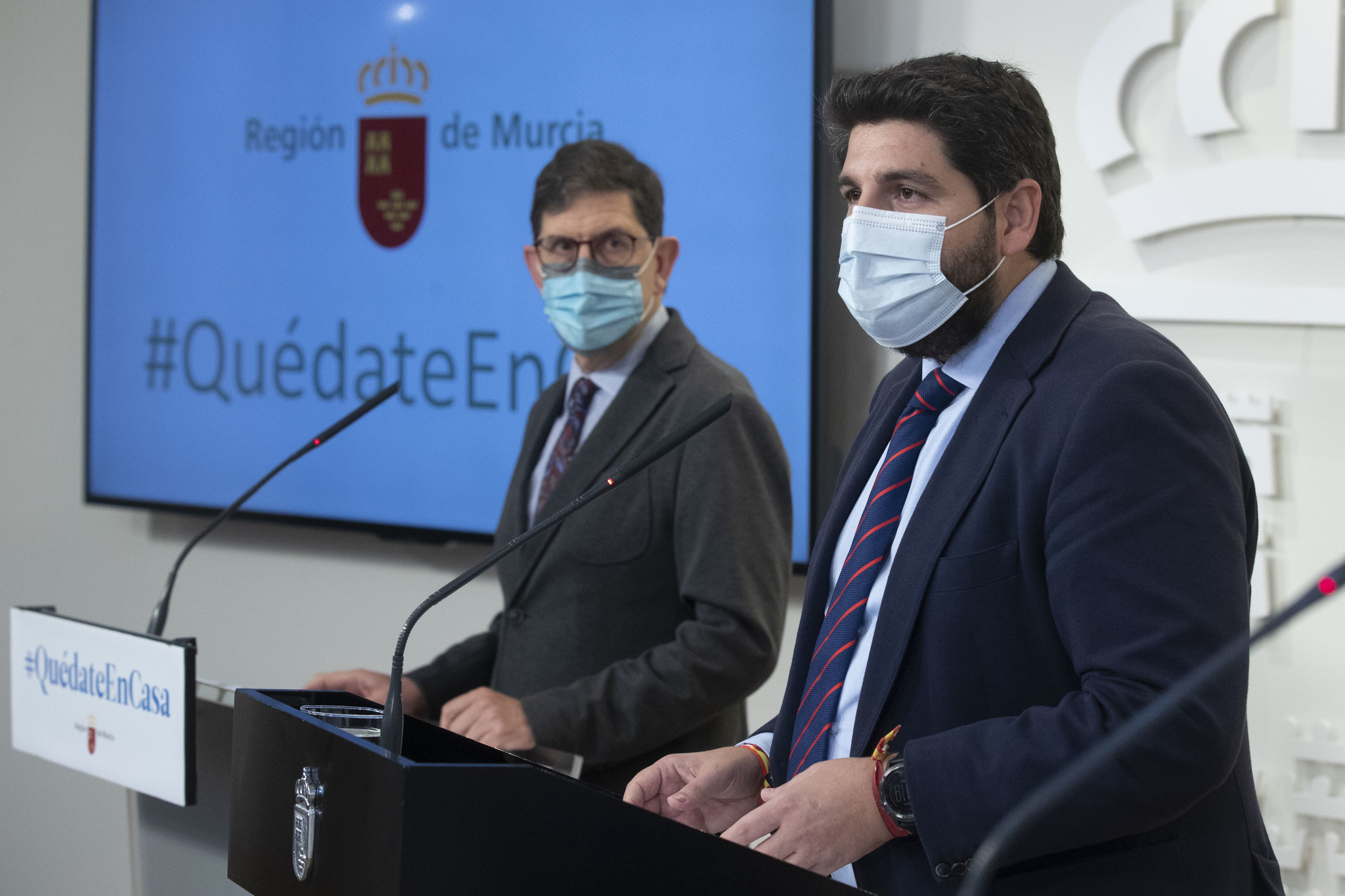 El presidente de la Comunidad Autónoma, Fernando López Miras, junto al consejero de Salud, Manuel Villegas (izq.).