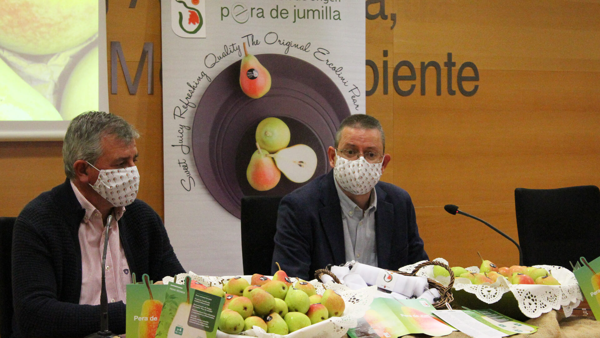 El director general José Gómez, junto al presidente de la DOP, José Verdú, durante la campaña de promoción de la Pera de Jumilla