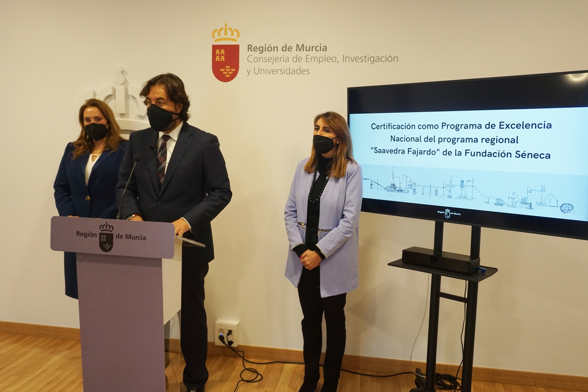 El consejero de Empleo, Investigación y Universidades, Miguel Motas, junto a las directoras generales Josefina García e Isabel Fortea, presentaron la certificación concedida por el Ministerio al programa regional Saavedra Fajardo, de la Fundación Séneca, como Programa de Excelencia Nacional