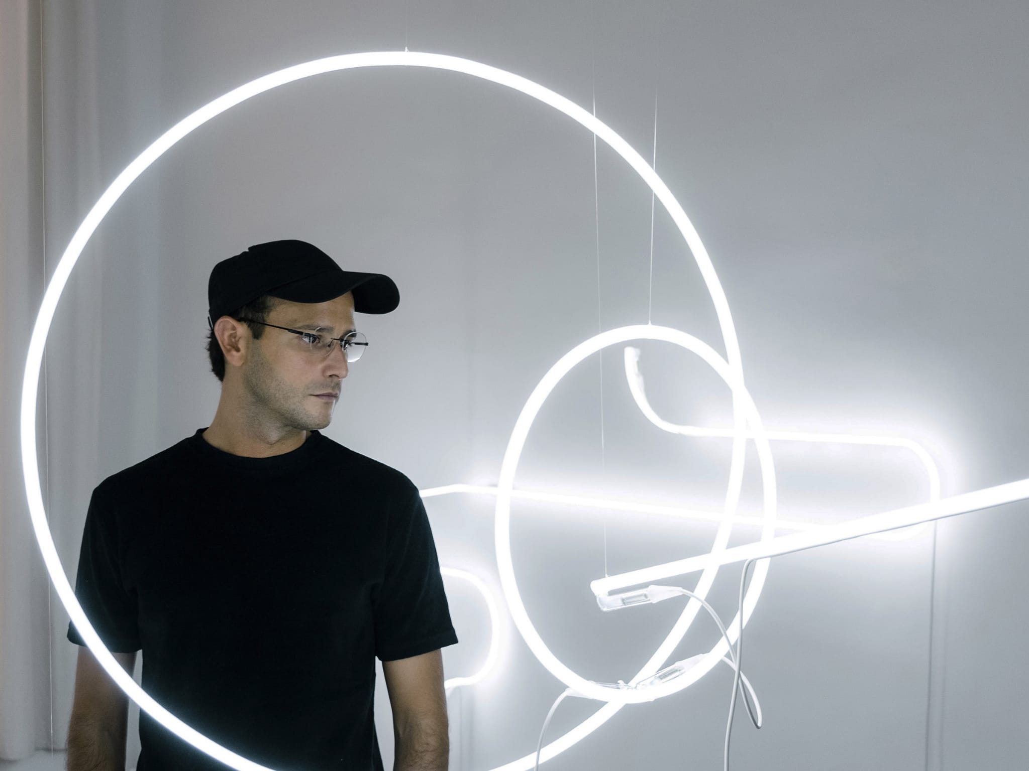 Imagen del artista Pedro Torre con una de las obras de la exposición 'No calma, no cura, no sublima'