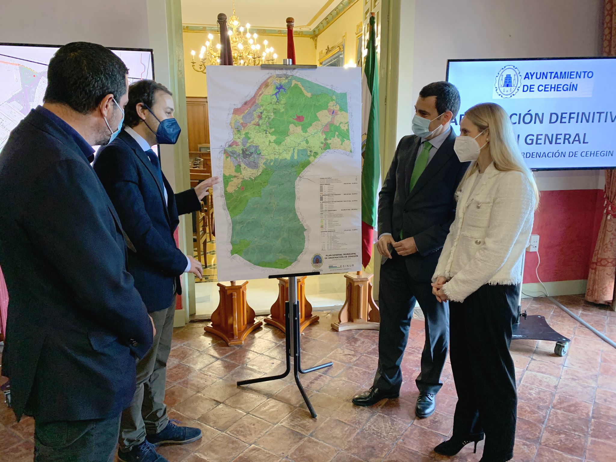 (i-d) La alcaldesa de Cehegín, Alicia del Amor, el consejero de Fomento e Infraestructuras, José Ramón Díez de Revenga, el director general de Territorio y Arquitectura, Jaime Pérez Zulueta, y el concejal Pedro Lorenzo tras la presentación de la aprobación definitiva del Plan General de Ordenación Urbana del municipio.