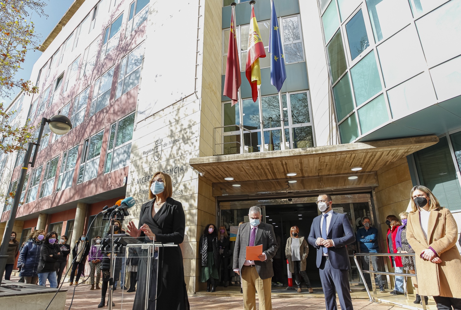 La vicepresidenta y consejera de Mujer, Igualdad, LGTBI, Familias y Política Social, Isabel Franco, leyó esta mañana el Manifiesto 8M 2021, ‘Mujeres líderes: Por un futuro igualitario en el mundo de la Covid-19’, en un acto a las puertas de la Consejería, junto al equipo directivo y funcionarios de la misma.