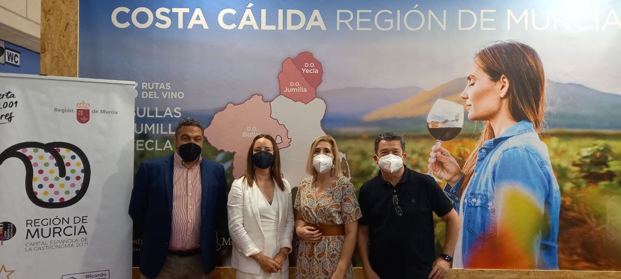 La presidenta de Rutas del Vino de España, Ana Cano, y el auditor y consultor de ACEVIN, Fernando Redondo, junto a técnicos del Itrem en el stand de la Región durante la celebración de la feria Fine Wine.