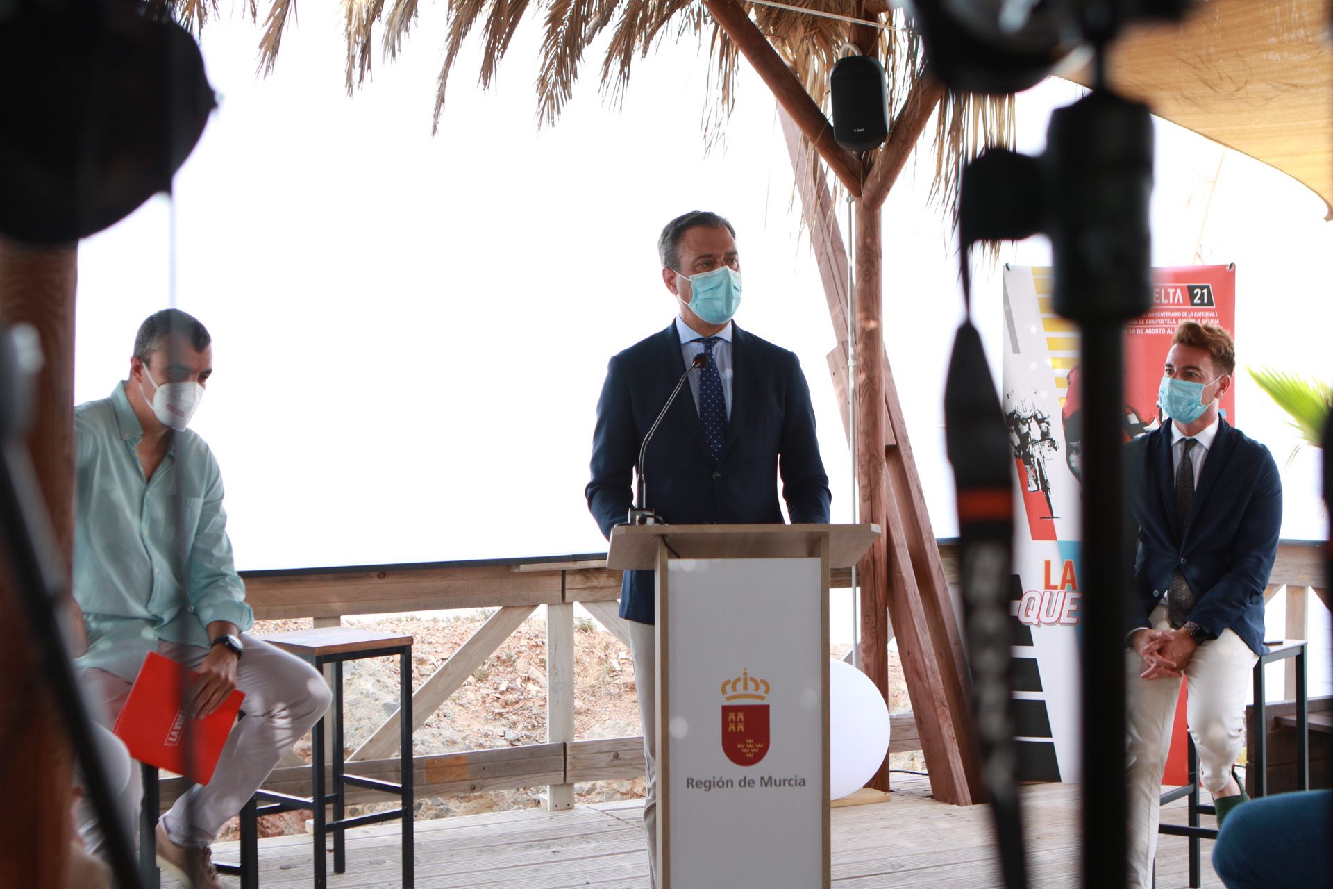 El consejero de Presidencia, Turismo y Deportes, Marcos Ortuño, durante su intervención en la presentación de La Vuelta, acompañado por el director general de Deportes, Francisco Sánchez, y el director de Unipublic, Javier Guillén