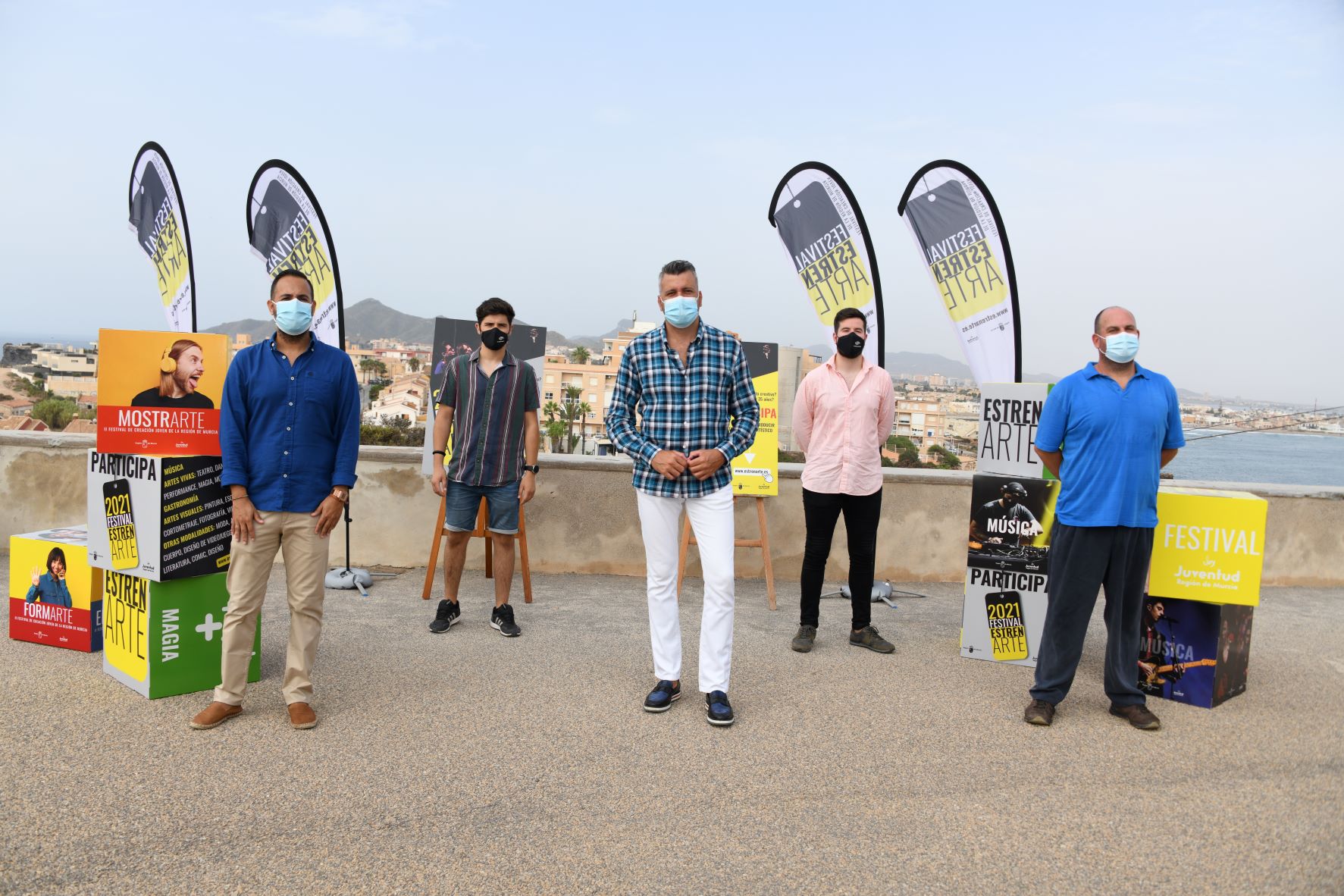El director general de Juventud, José Manuel López, el concejal de Juventud e Igualdad de Cartagena, David Martínez, y el Vicerrector de Estudiantes, Cultura y Deportes de la UPCT, Sergio Amat, junto con los dos músicos que actuaron en la presentación