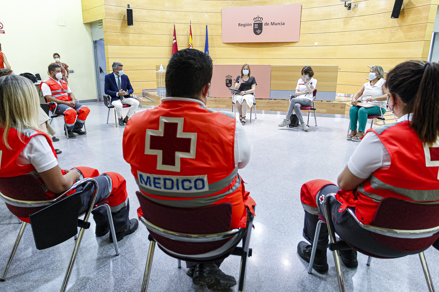 La vicepresidenta y consejera de Mujer, Igualdad, LGTBI, Familias y Política Social, Isabel Franco, recibió hoy al equipo ERIE de Asistencia Sanitaria de Cruz Roja Región de Murcia que ha participado estos días en el operativo de acogida de personas refugiadas afganas en la base de Torrejón de Ardoz, así como a voluntarios de Cruz Roja Juventud, que le han trasladado cómo ha sido su experiencia y toma de contacto con los refugiados en el campamento instalado en el aeródromo madrileño. En el encuentro también estuvieron presentes la coordinadora autonómica y la vicepresidenta autonómica de Cruz Roja, Asunción Juárez y Maite Sánchez Elduayen.