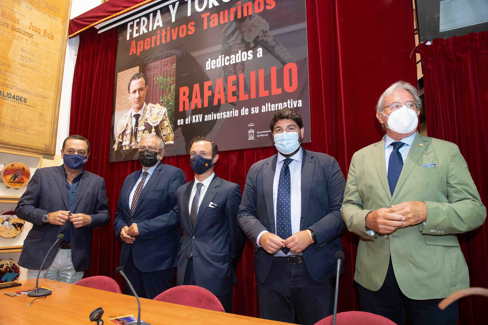 El jefe del Ejecutivo regional, Fernando López Miras, participó hoy en los tradicionales ‘Aperitivos Taurinos’ que organiza el Real Club Taurino de Murcia en los que se realizó un homenaje al torero Rafael Rubio ‘Rafaelillo’ por el 25 aniversario de su alternativa. López Miras aseguró que “el día de hoy es agridulce porque no hay Feria Taurina de Septiembre y Rafaelillo no podrá estar esta tarde en la Condomina, pero desde el Gobierno regional vamos a colaborar en todo lo posible para que el diestro pueda celebrar su 25 aniversario en el coso murciano”.