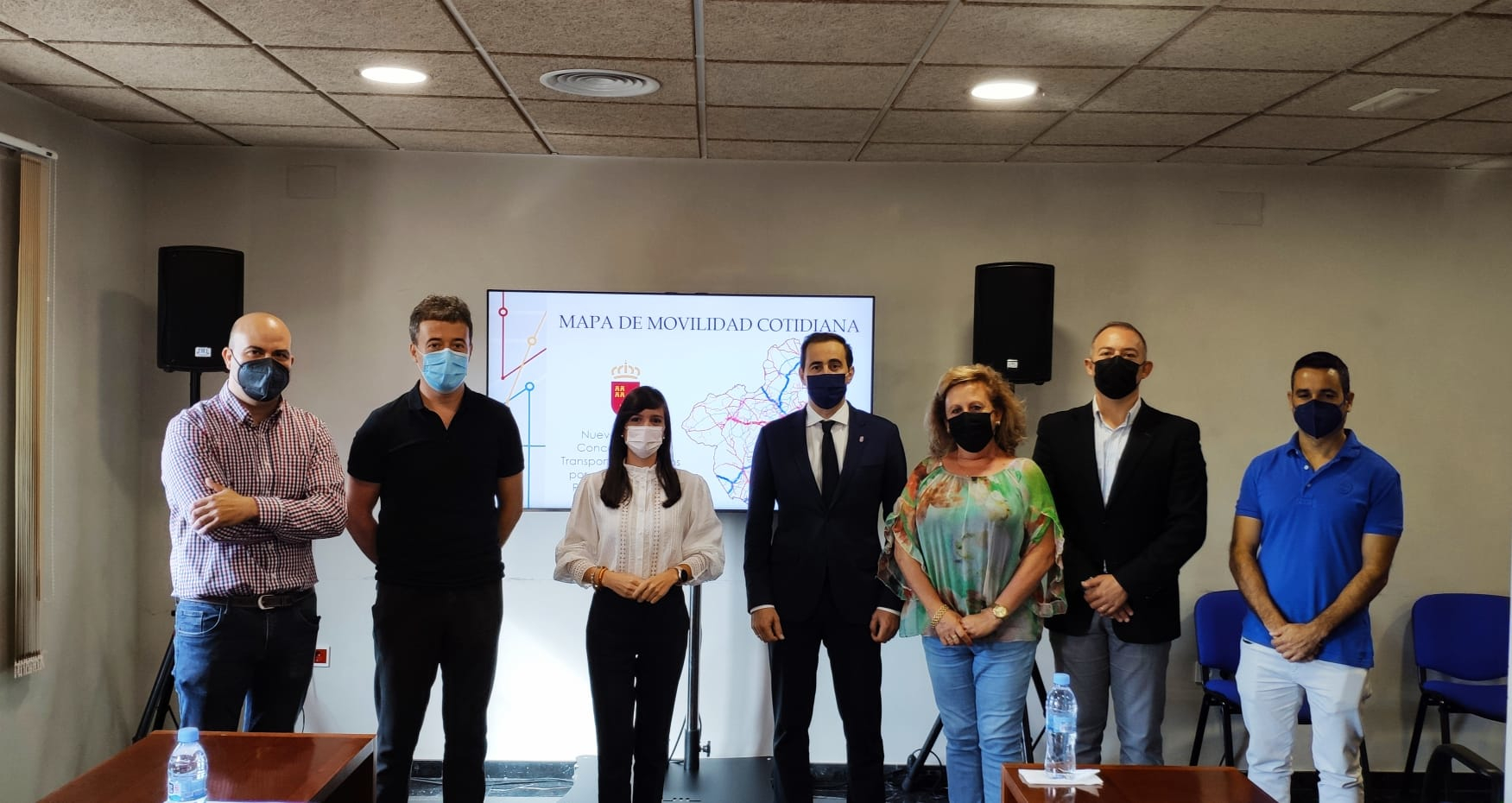 La directora general de Movilidad y Litoral, Marina Munuera, y los alcaldes del Valle de Ricote tras la reunión en la que ha presentado las novedades del Mapa de Movilidad Cotidiana.