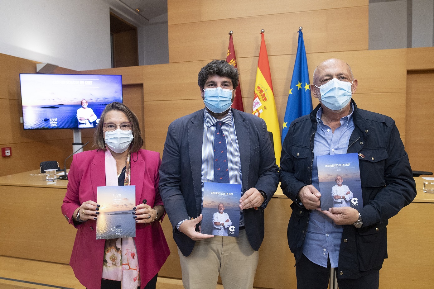 El jefe del Ejecutivo regional, Fernando López Miras, presidió hoy el acto de presentación del libro ‘Confidencias de un chef de la Región de Murcia’, editado por la delegación regional de Cadena Cope en reconocimiento a la trayectoria profesional del cocinero murciano Juan Antonio Pellicer, donde reafirmó la apuesta del Gobierno autonómico por el turismo gastronómico, “porque es uno de nuestros grandes activos económicos y debemos seguir potenciándolo entre todos: las administraciones públicas, productores, cocineros, y también los medios de comunicación”.