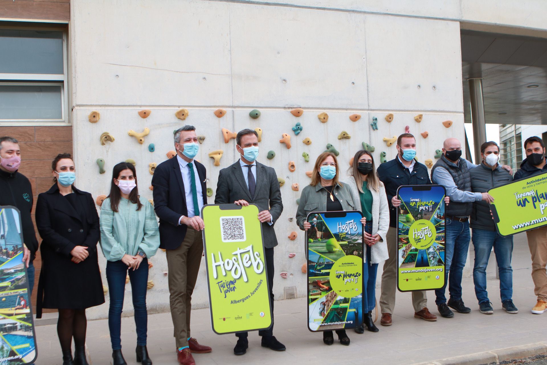 El consejero de Presidencia, Turismo y Deportes, la alcaldesa de San Pedro del Pinatar y el director general de Juventud, acompañados por representantes de los albergues juveniles, muestran la imagen gráfica de la campaña tras su presentación