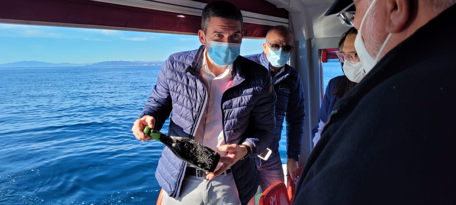 El consejero Antonio Luengo, con una botella extraída de la bodega submarina