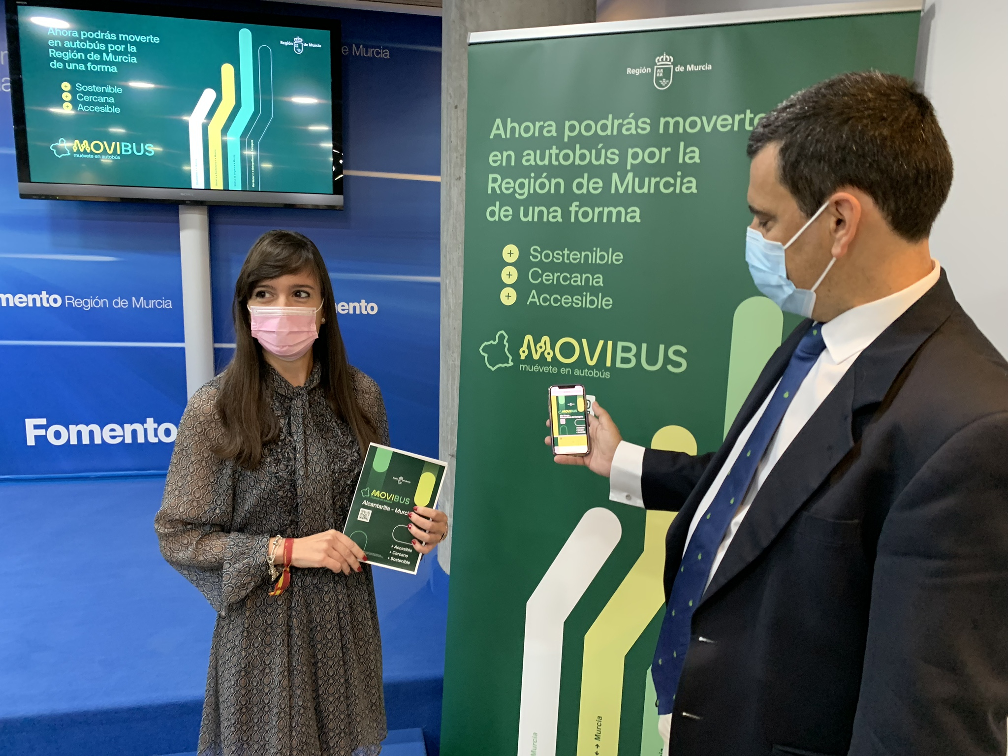 El consejero de Fomento e Infraestructuras, José Ramón Díez de Revenga, y la directora general de Movilidad y Litoral, Marina Munuera, durante la presentación de la marca y la campaña de difusión del nuevo sistema de movilidad interurbana de la Región de Murcia, `Movibus´