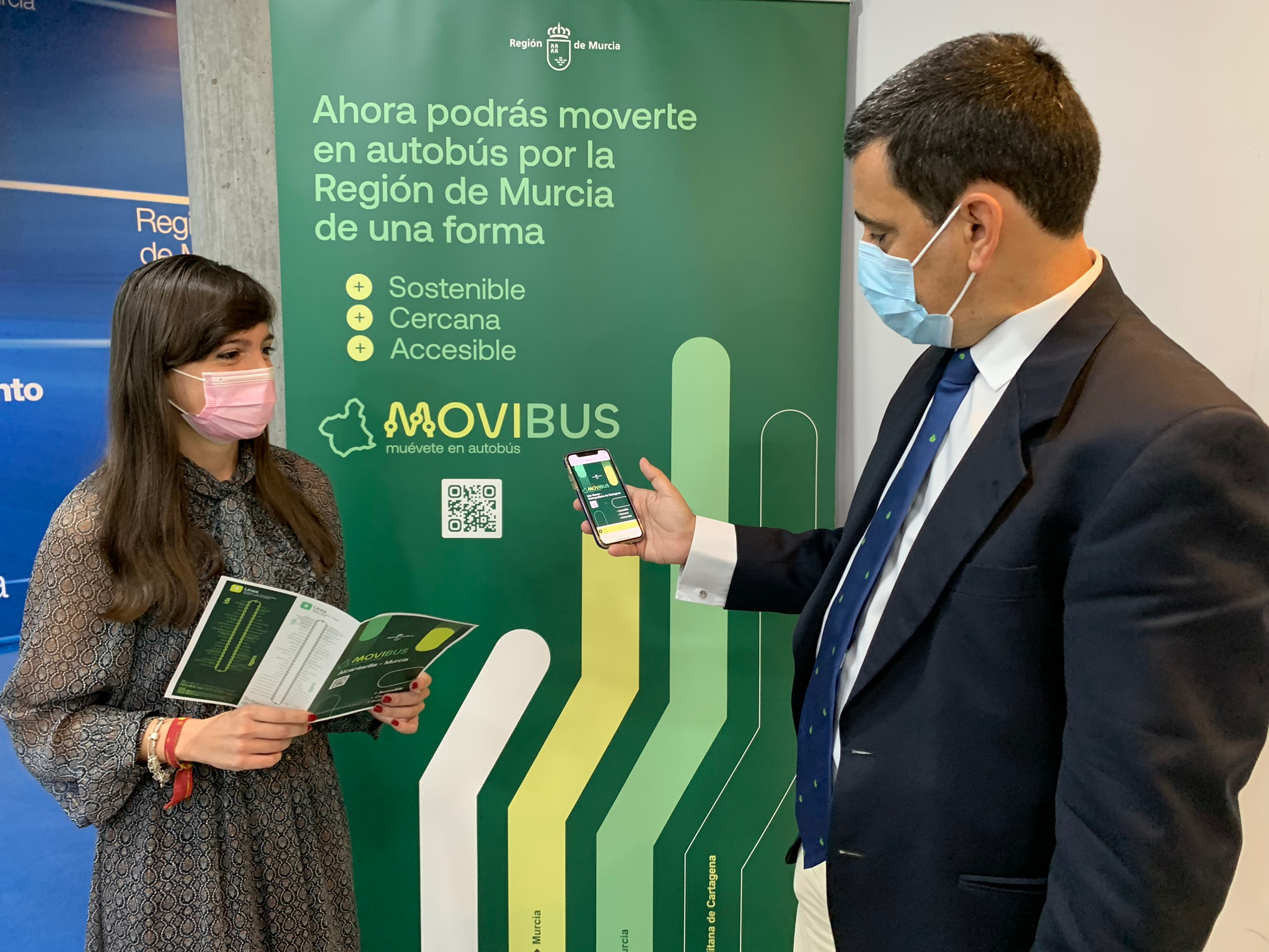El consejero de Fomento e Infraestructuras, José Ramón Díez de Revenga, y la directora general de Movilidad y Litoral, Marina Munuera, durante la presentación de la marca y la campaña de difusión del nuevo sistema de movilidad interurbana de la Región de Murcia, `Movibus´ (1)