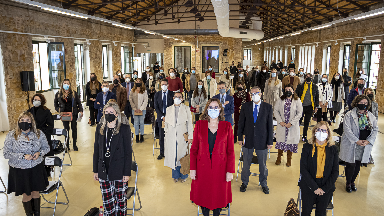 La vicepresidenta Isabel Franco, en el centro, junto a responsables de la Fundación La Caixa y el periódico La Verdad, y las entidades participantes en la convocatoria del Programa de Ayudas a Proyectos e Iniciativas Sociales 2021