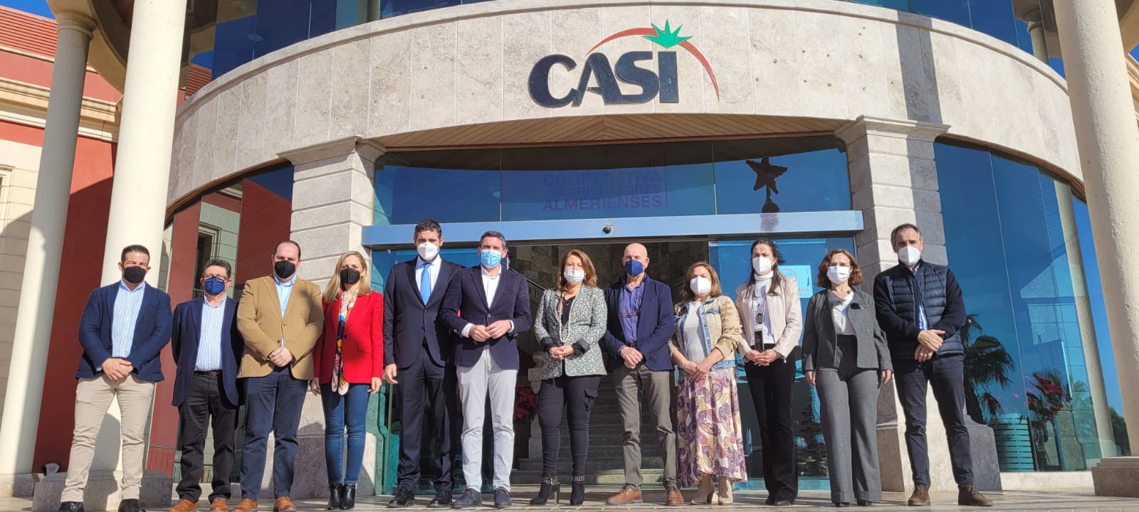 Los consejeros de la Región de Murcia y Andalucía, junto con representantes de la Cooperativa Agrícola San Isidro (CASI) y otras autoridades, a las puertas de una de las sedes de la empresa