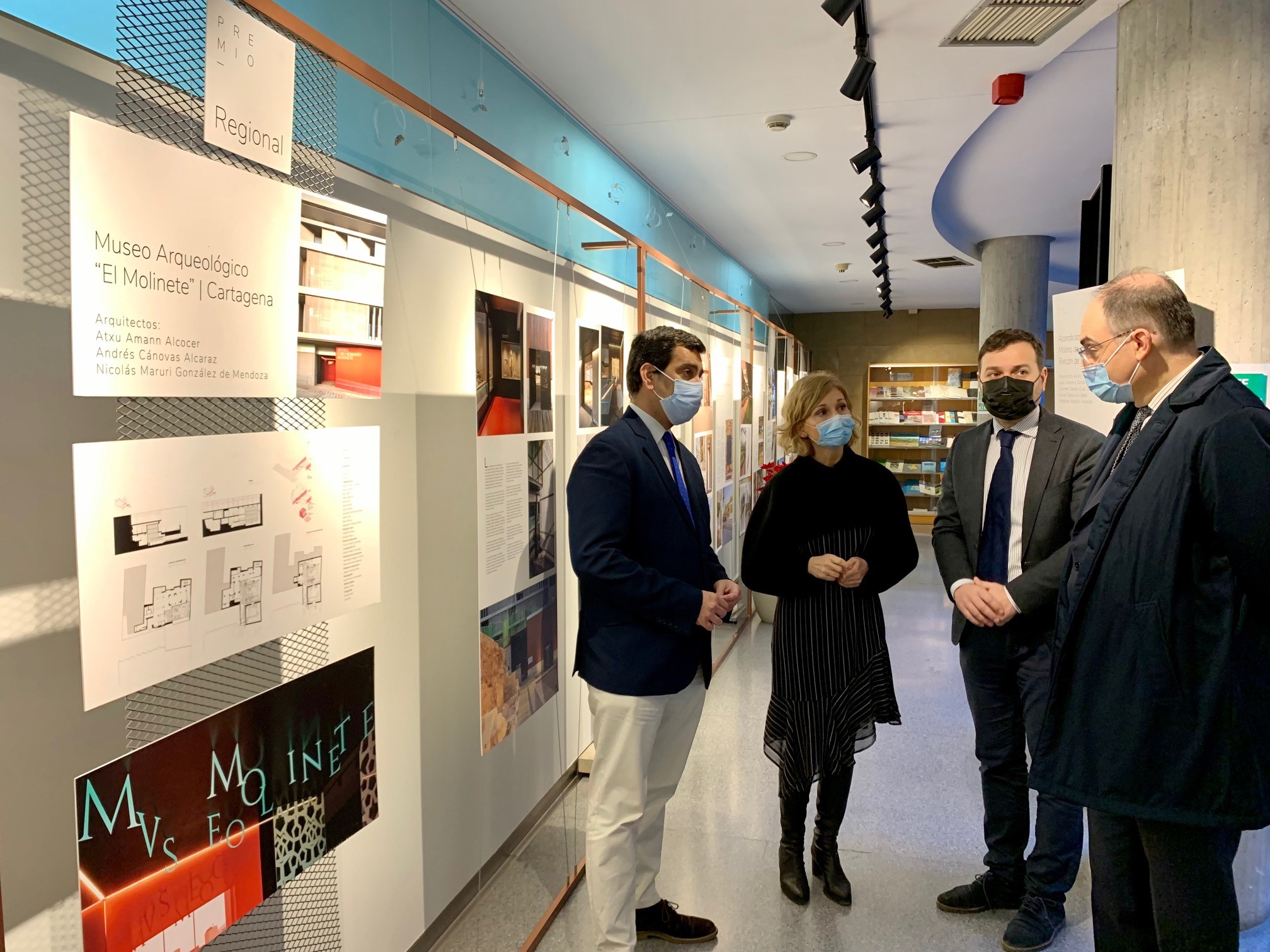La Consejería de Fomento e Infraestructuras acoge la exposición de las obras galardonadas en la XXI Edición de los Premios de Arquitectura de la Región de Murcia, organizados el pasado año por la Comunidad Autónoma y el Colegio Oficial de Arquitectos de la Región de Murcia en colaboración con la Fundación Cajamurcia y Caixabank. El consejero José Ramón Díez de Revenga, la decana del Colegio de Arquitectos, María José Peñalver, el director de Arquitectura, Jaime Pérez Zulueta y el director de la Fundación Cajamurcia, Pascual Martínez, inauguraron hoy la muestra que estará abierta al público hasta el próximo 1 de marzo.