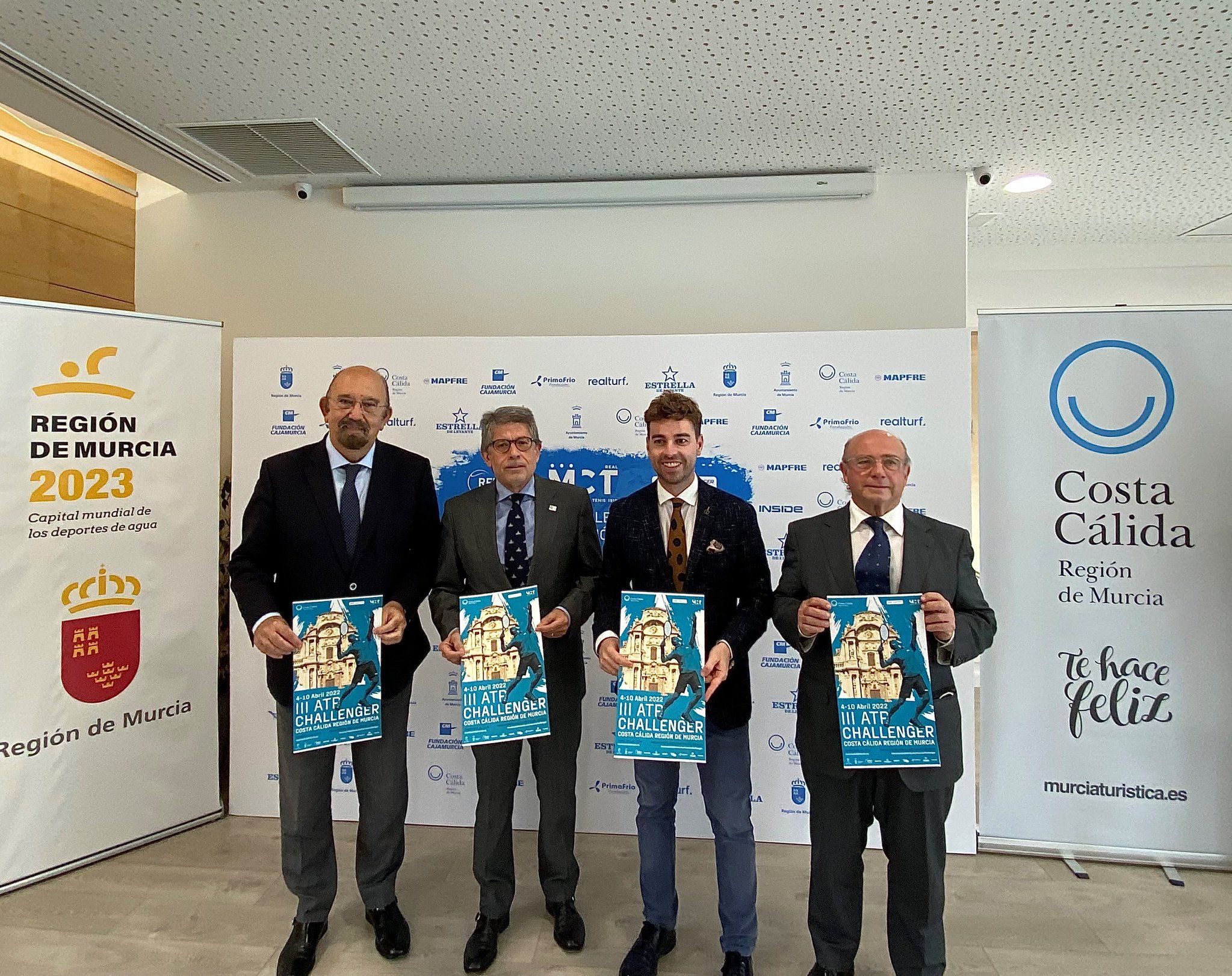 El presidente de la Federación Española de Tenis, Miguel Díaz (1i), el presidente del Murcia Club de Tenis, Antonio Saura, (2i), el director general de Deportes, Francisco Javier Sánchez (2d) y el presidente de la Federación Murciana de Tenis, José Alcolea (1d), tras la presentación del evento