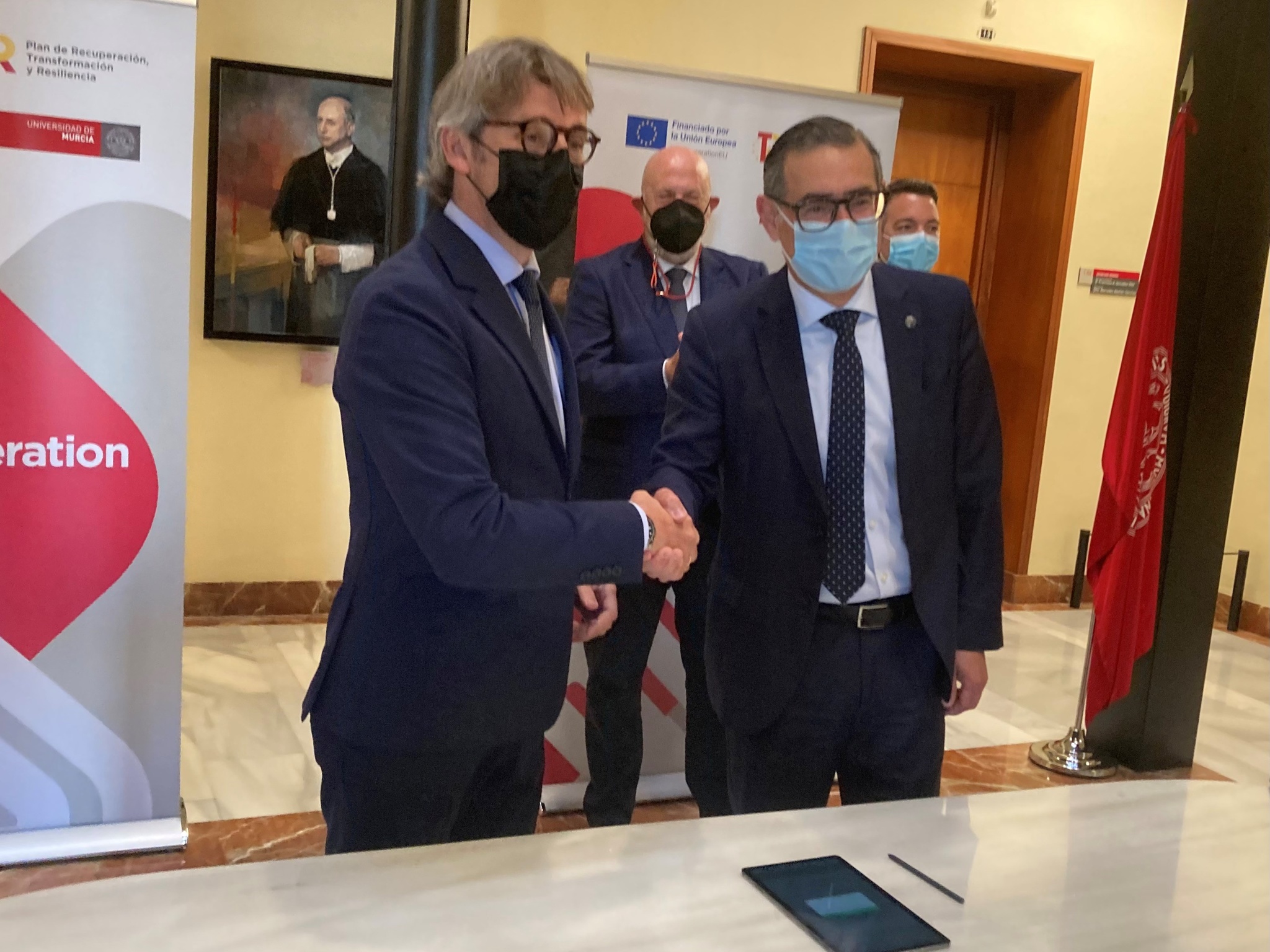 , José Luján, se saludan tras la firma del convenio por el que las dos instituciones colaborarán en la dinamización de los proyectos Next