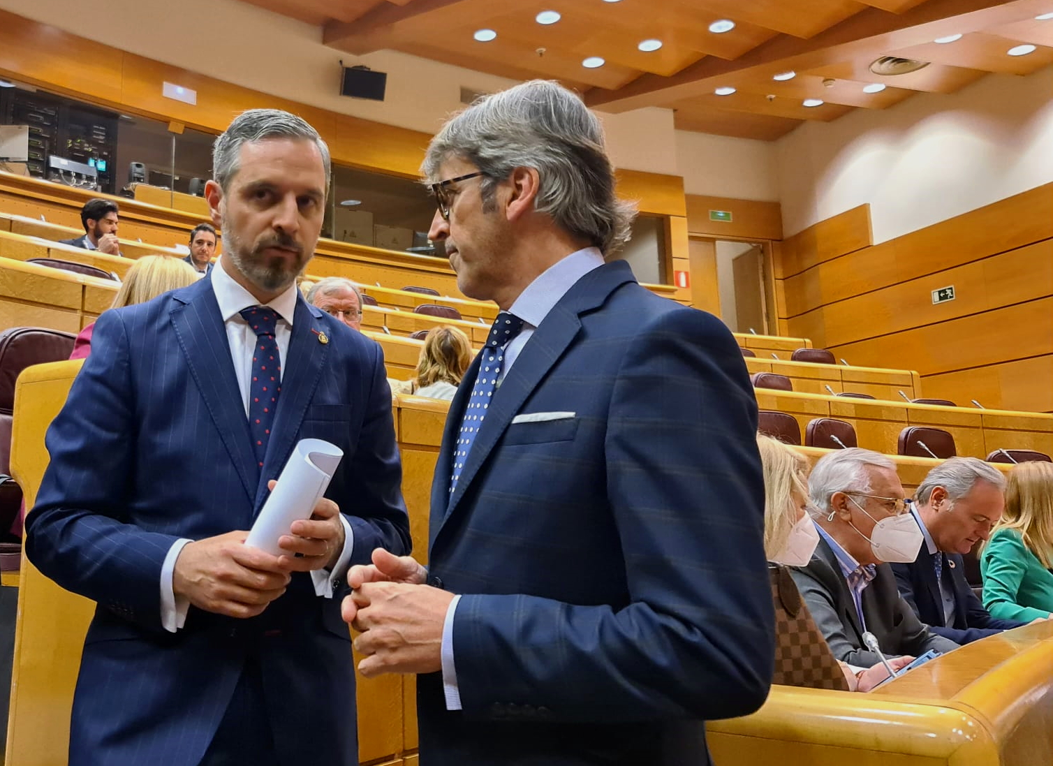 El consejero de Economía, Hacienda y Administración Digital, Luis Alberto Marín, conversa con su homólogo andaluz, Juan Bravo, instantes antes de comenzar la sesión del Senado