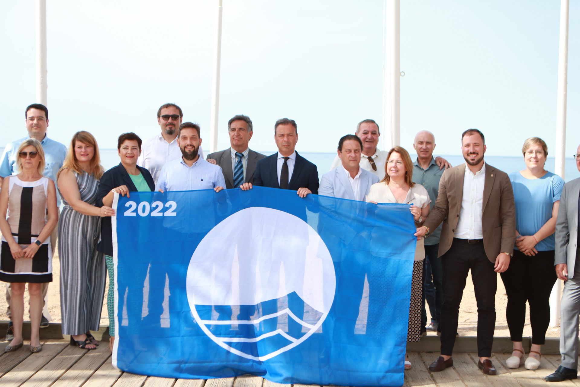 El consejero de Presidencia, Turismo, Cultura y Deportes, Marcos Ortuño, junto a representantes de los municipios cuyas playas y puertos han obtenido Banderas Azules