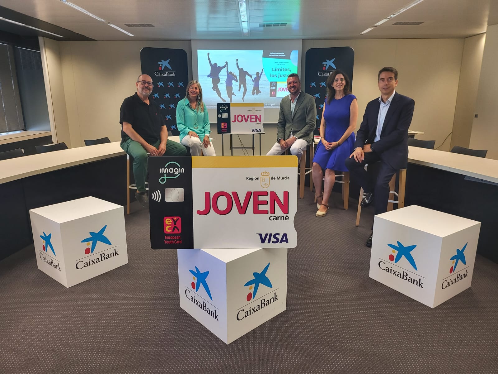 La directora territorial de CaixaBank en la Región de Murcia, Olga García Saez (2i), y el director general de Juventud, José Manuel López (3d), junto a técnicos de la dirección general y la entidad financiera.