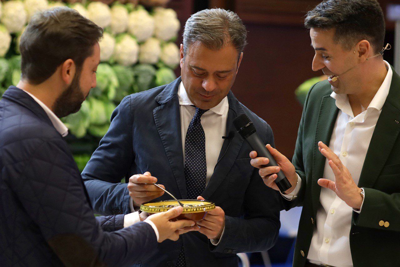 El consejero de Presidencia, Turismo, Cultura y Deportes, Marcos Ortuño, degusta algunas de las elaboraciones preparadas por los chefs en el stand de la Región