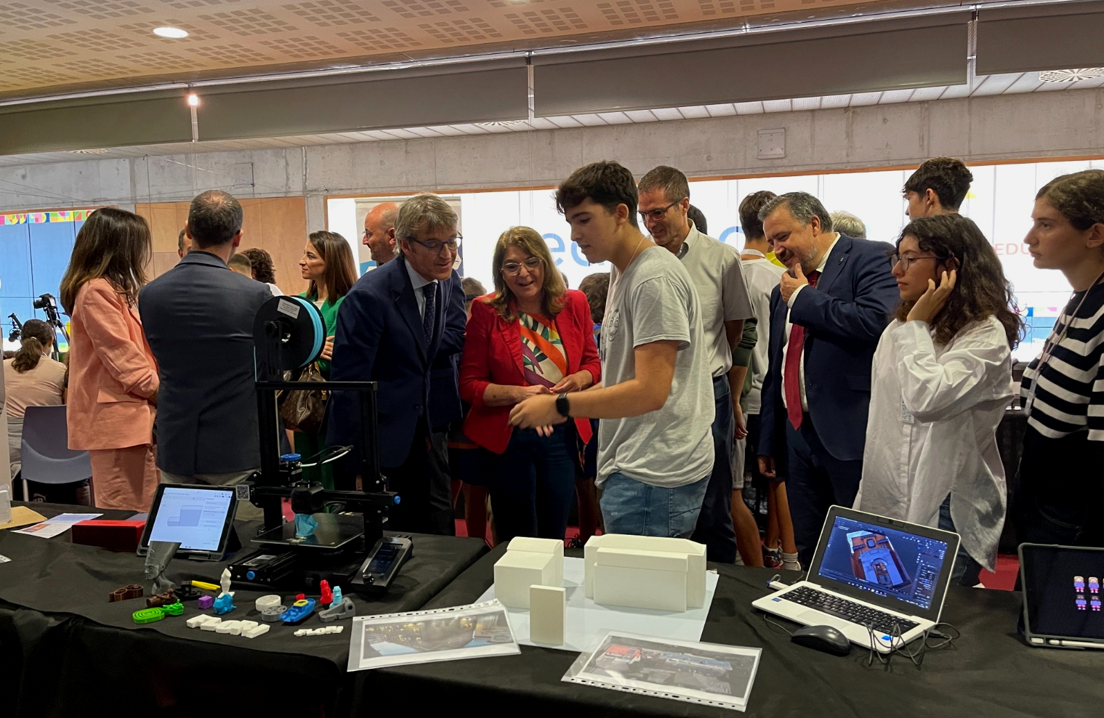 Los consejeros de Economía, Hacienda y Administración Digital, Luis Alberto Marín, y de Educación, María Isabel Campuzano, observan los proyectos elaborados por los alumnos participantes en la feria Edutech RM
