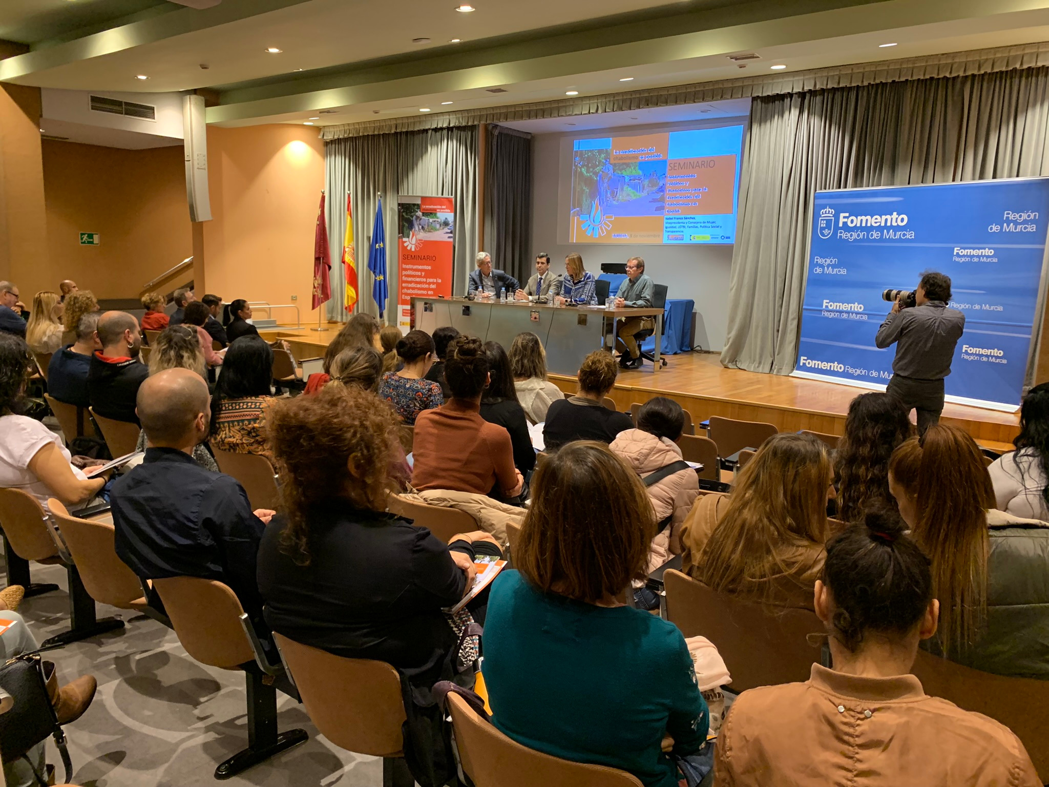 (i-d) El director de la Fundación Secretariado Gitano (FSG), Isidro Rodríguez, el consejero de Fomento e Infraestructuras, José Ramón Díez de Revenga, la vicepresidenta y consejera de Mujer, Igualdad, LGTBI, Familias, Política Social y Transparencia, Isabel Franco, y el director territorial de FSG en Murcia, Jesús Salmerón, durante la inauguración del Seminario 'Instrumentos políticos y financieros para la erradicación del chabolismo´.